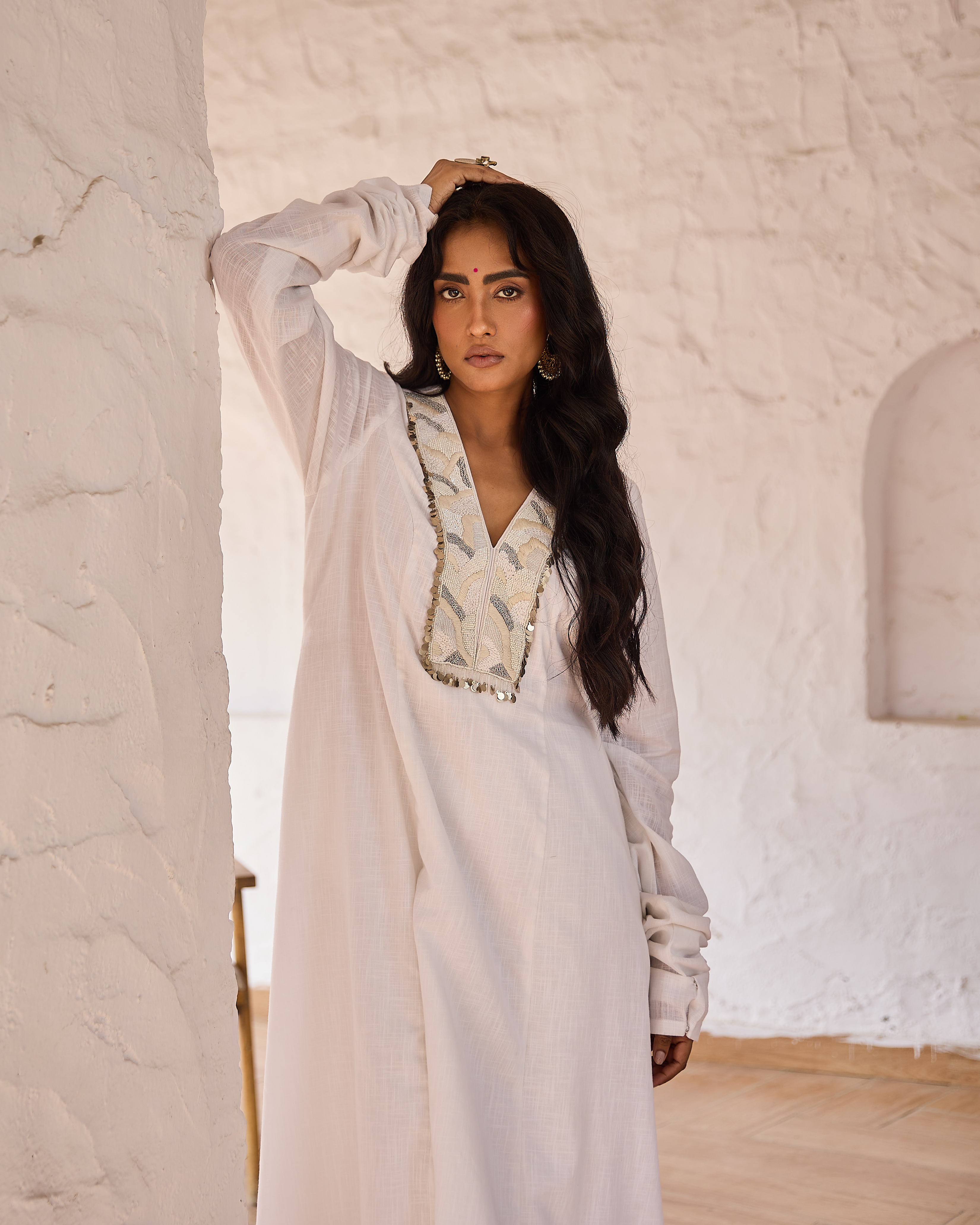 Aprajita white kurta set in a soft, breathable fabric, featuring a relaxed silhouette with delicate embroidery at the neckline and easy straight-fit pants. Effortless, elegant, and rooted in understated tradition.