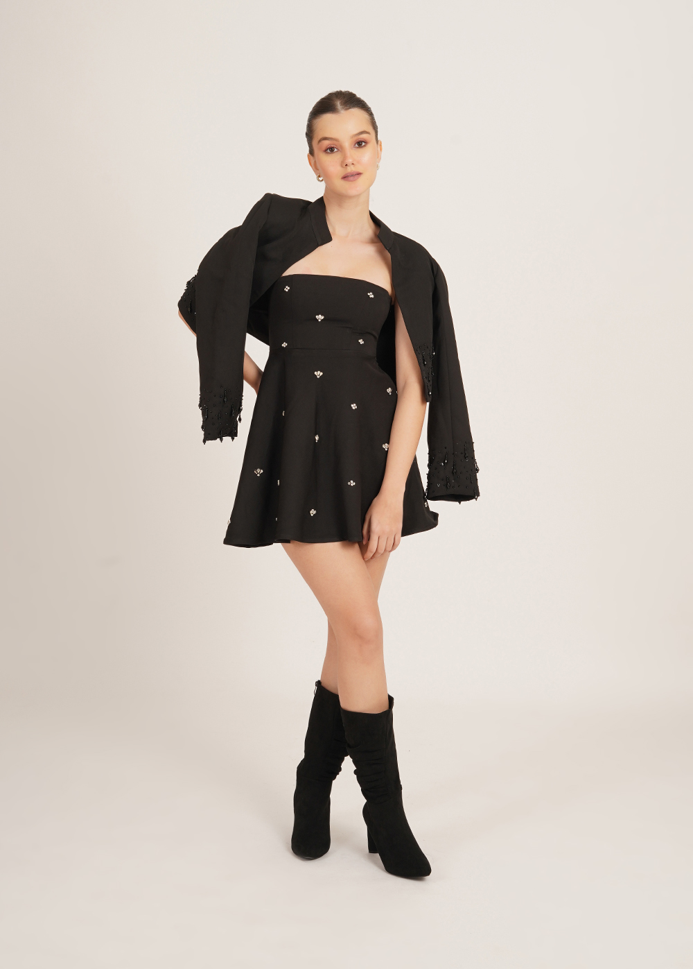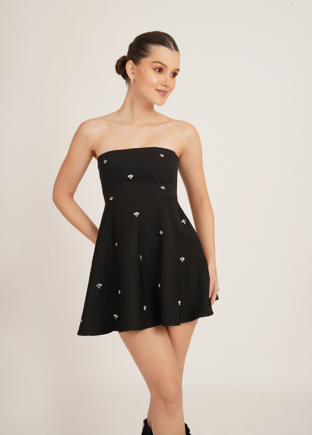 Description: Minimal, flirty, and effortlessly glam. This strapless mini dress is elevated with delicate handwork detailing scattered across the silhouette, adding subtle sparkle to its clean, flattering fit. Designed to make a statement, it's perfect for nights that call for understated drama.