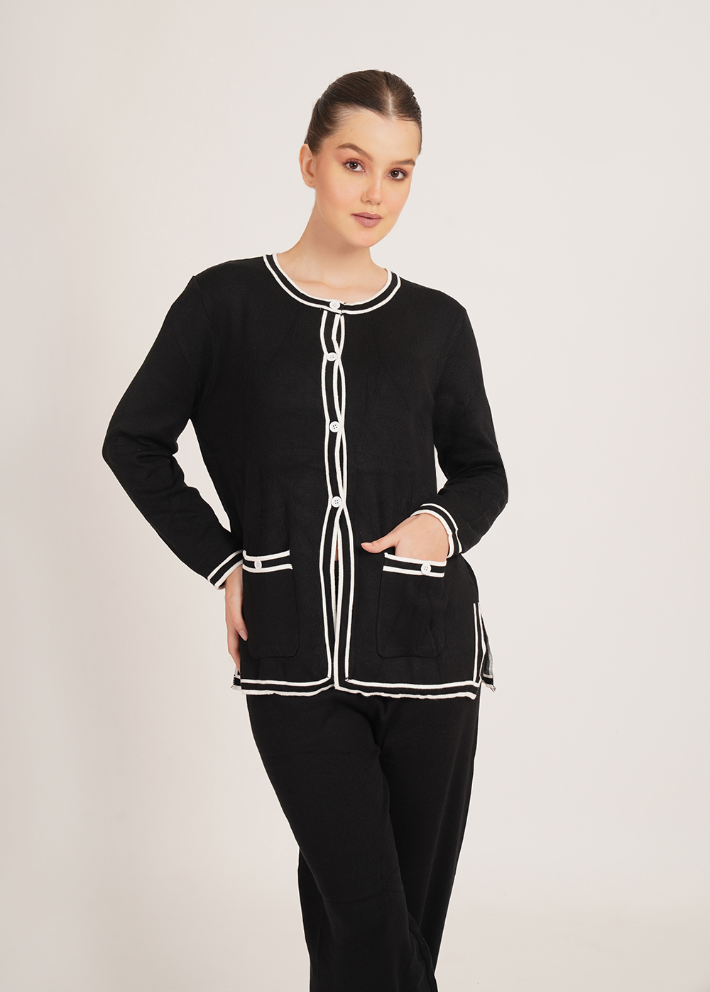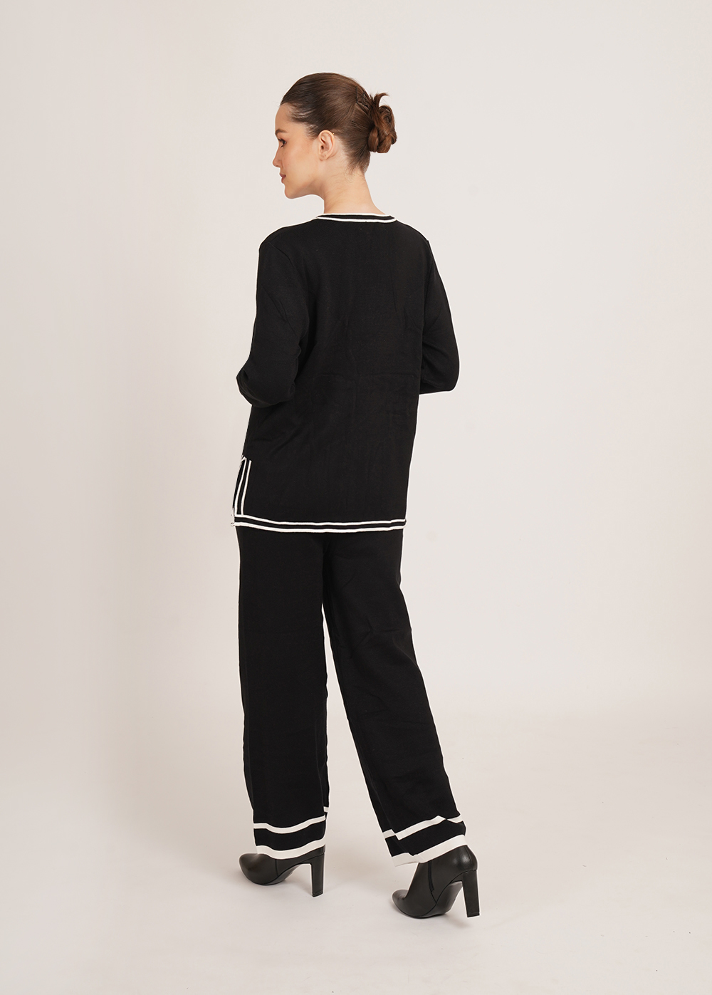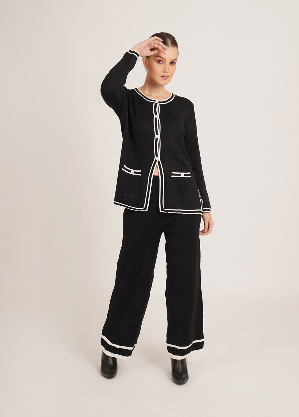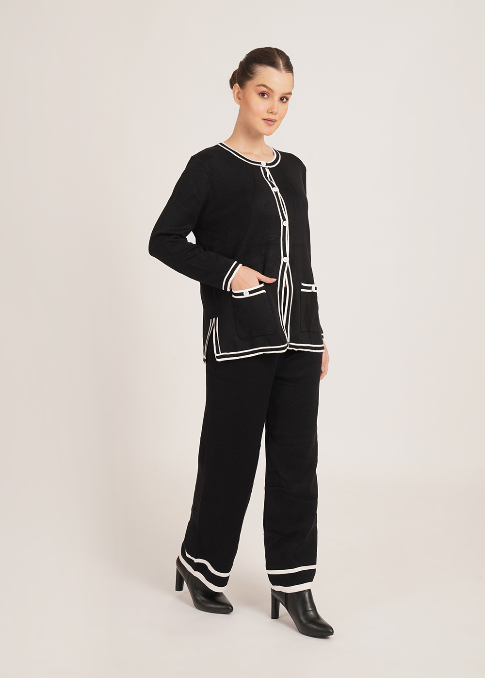 Description: Minimal, cosy, and effortlessly chic. Crafted in a soft winter knit, this two-piece set features a contrast-trim cardigan and relaxed trousers for a clean, polished silhouette that works day to night.Styling Tip: Pair with heeled ankle boots for an elevated look, or style the cardigan with jeans for easy everyday wear.