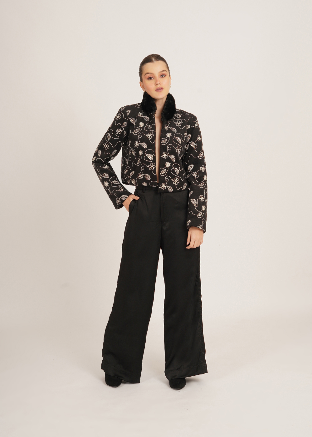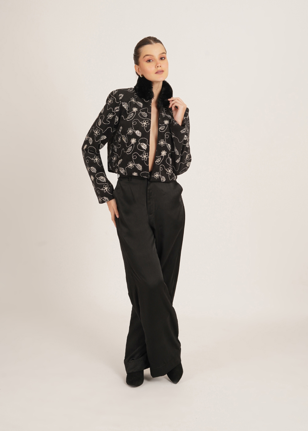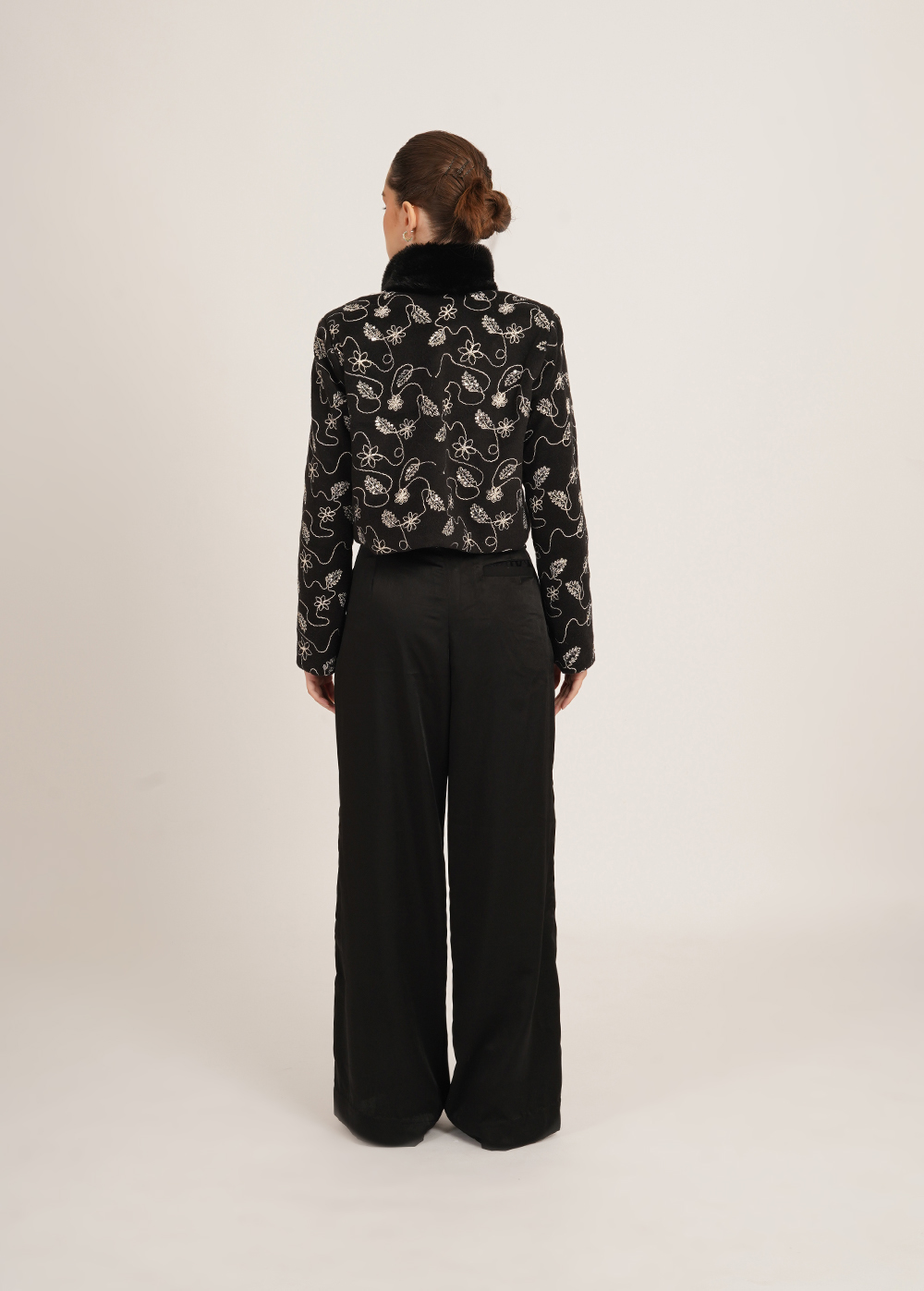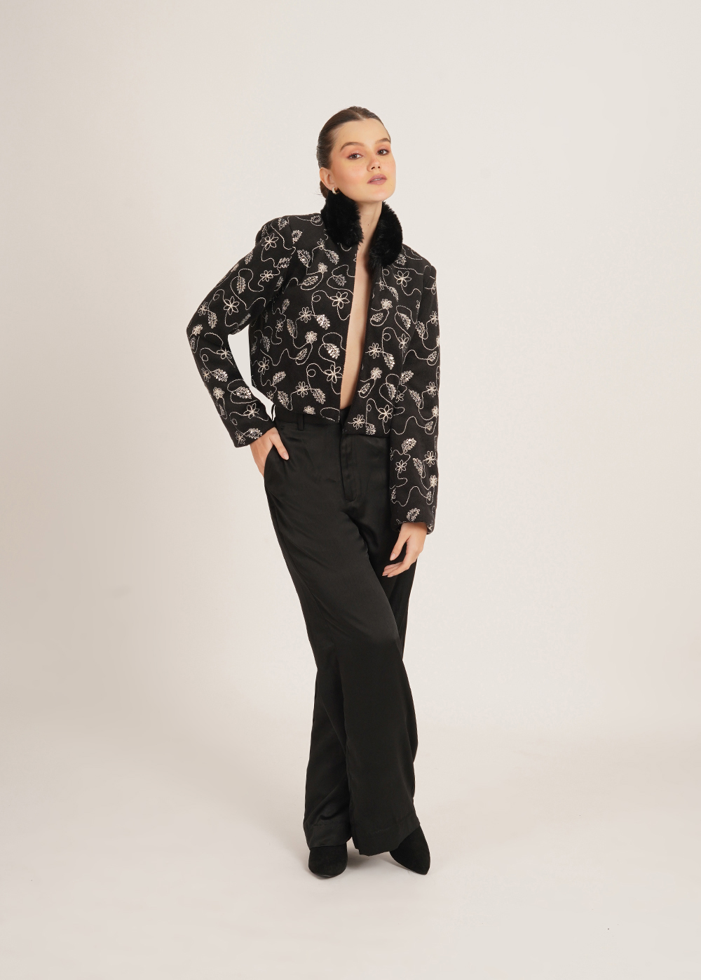 . Description: A winter statement with a touch of drama. This jacket is elevated with intricate embroidery and delicate embellishments, adding texture and sparkle to its sleek silhouette. Designed to stand out while staying versatile, it's perfect for layering over evening or festive looks.