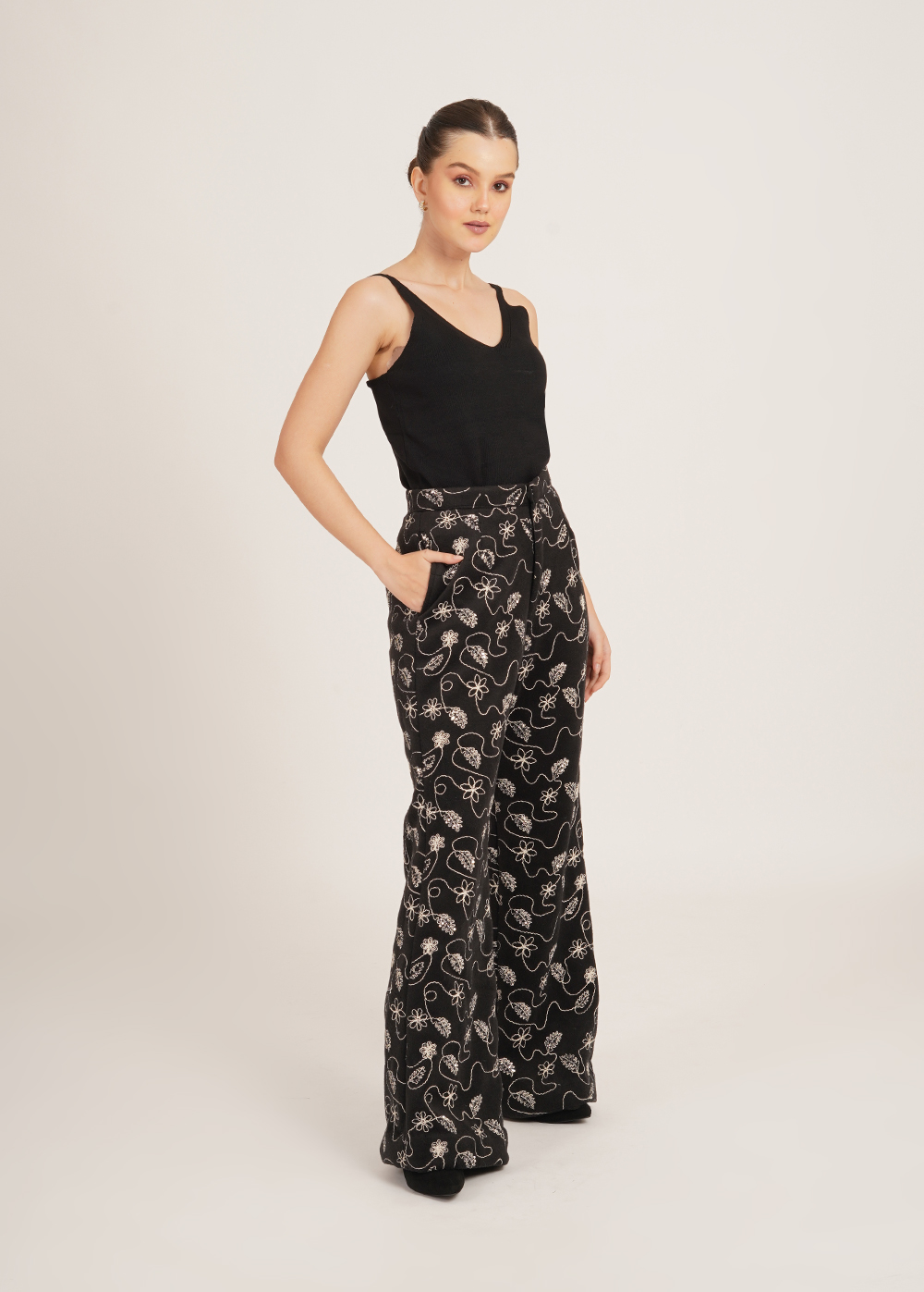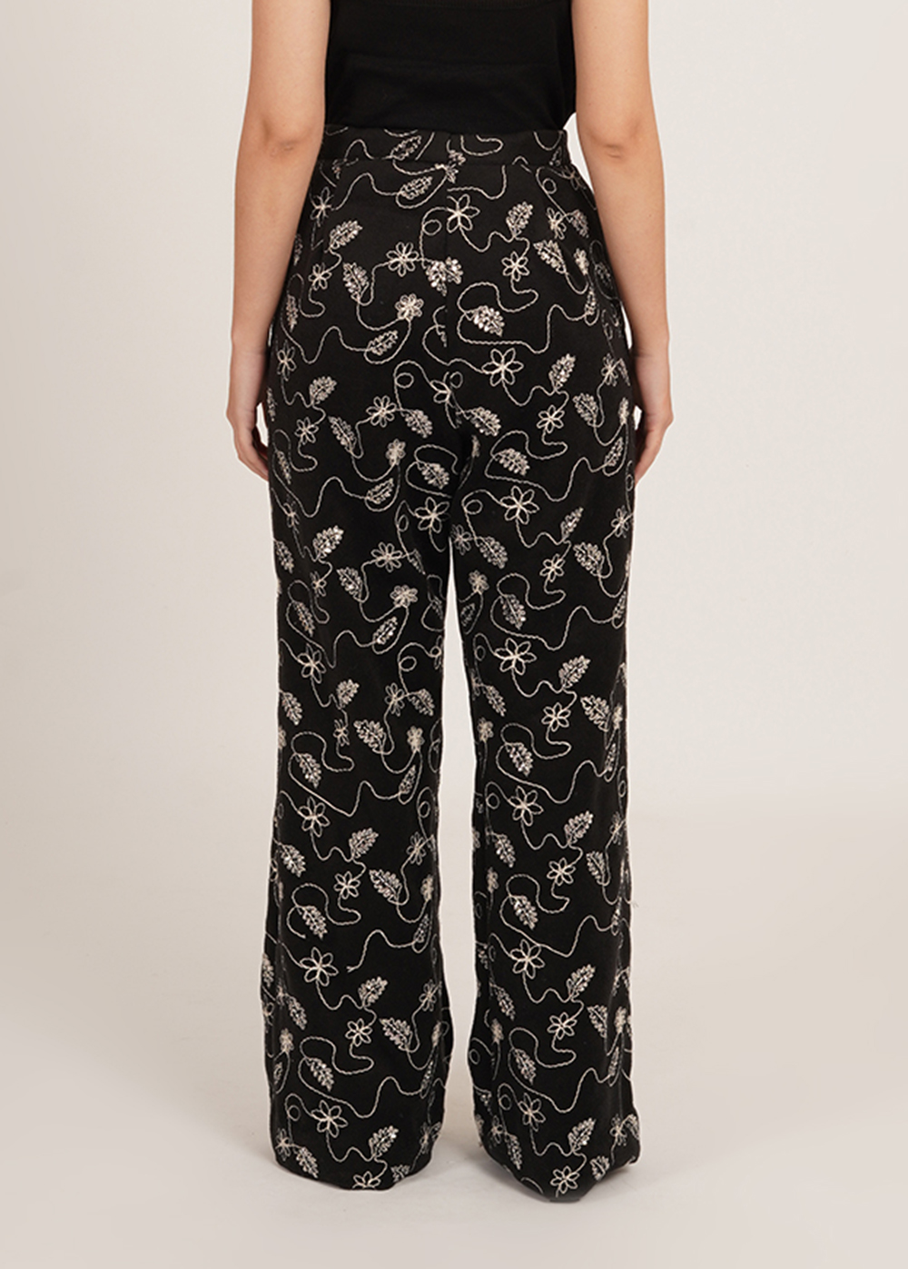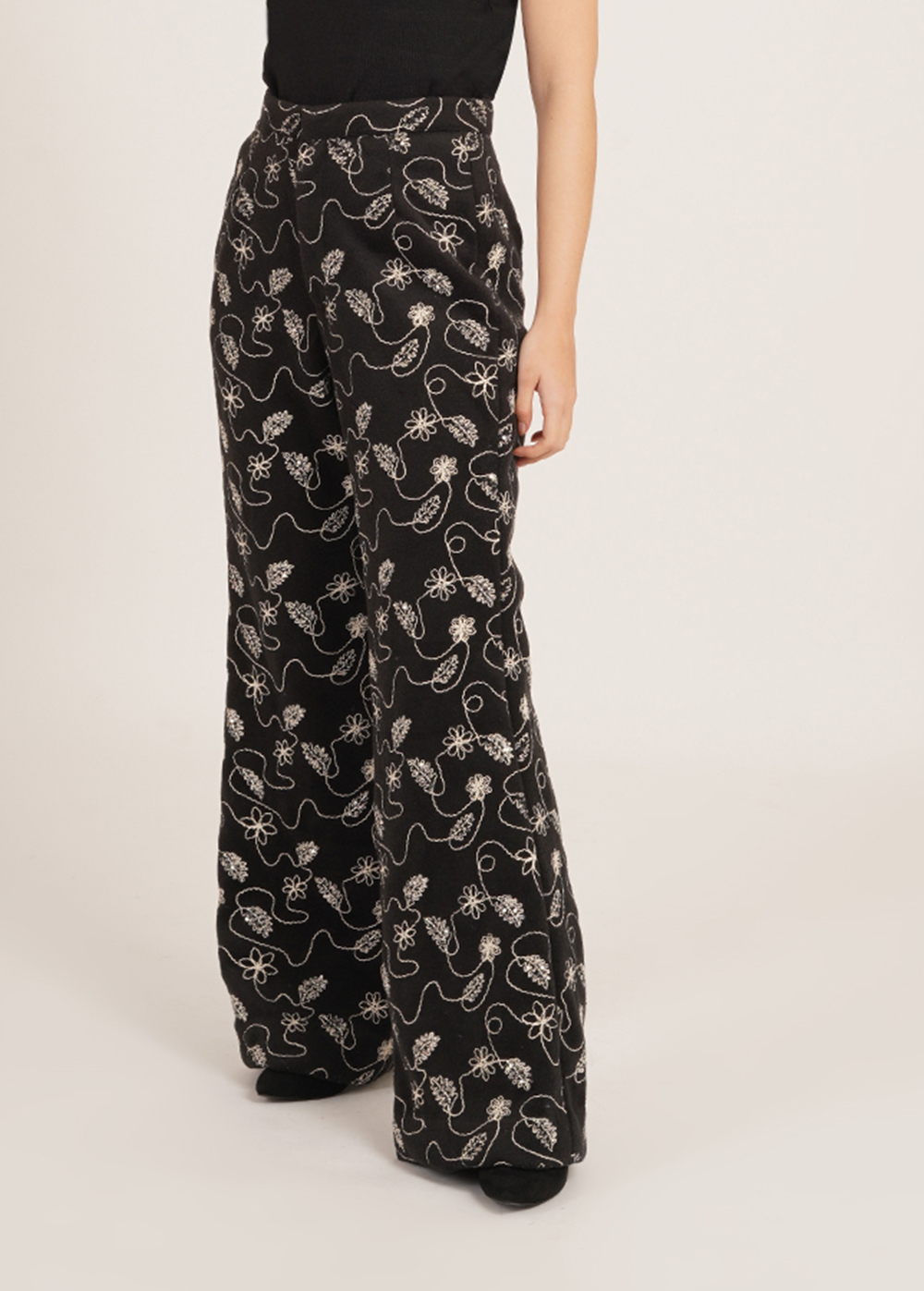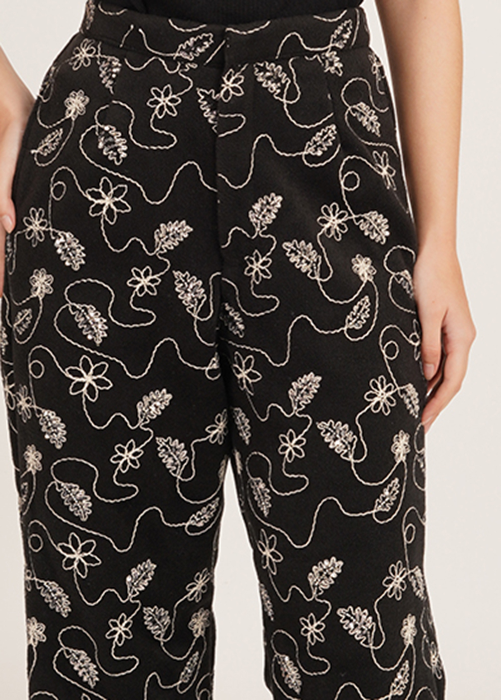 Description: Statement bottoms with effortless edge. These black pants are elevated with intricate embroidery and delicate embellishments, creating a bold contrast against the fluid silhouette. Designed to add interest while staying versatile, they're perfect for dressing up or down.