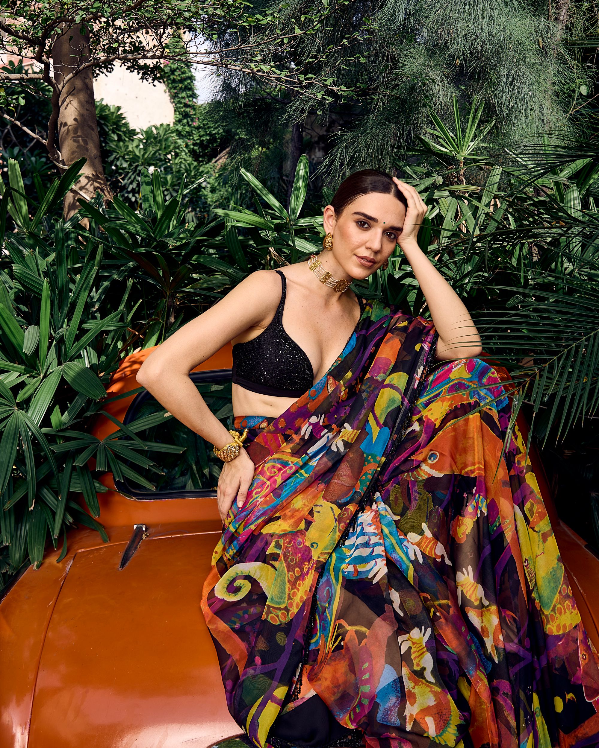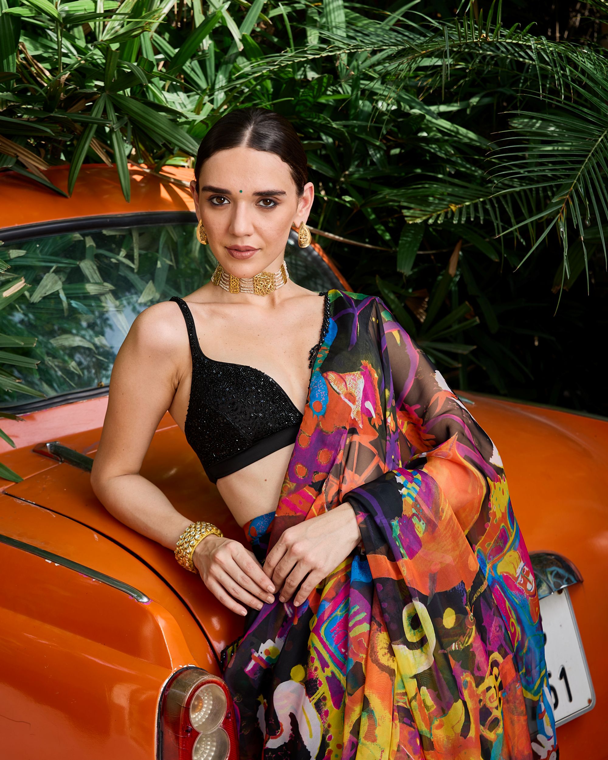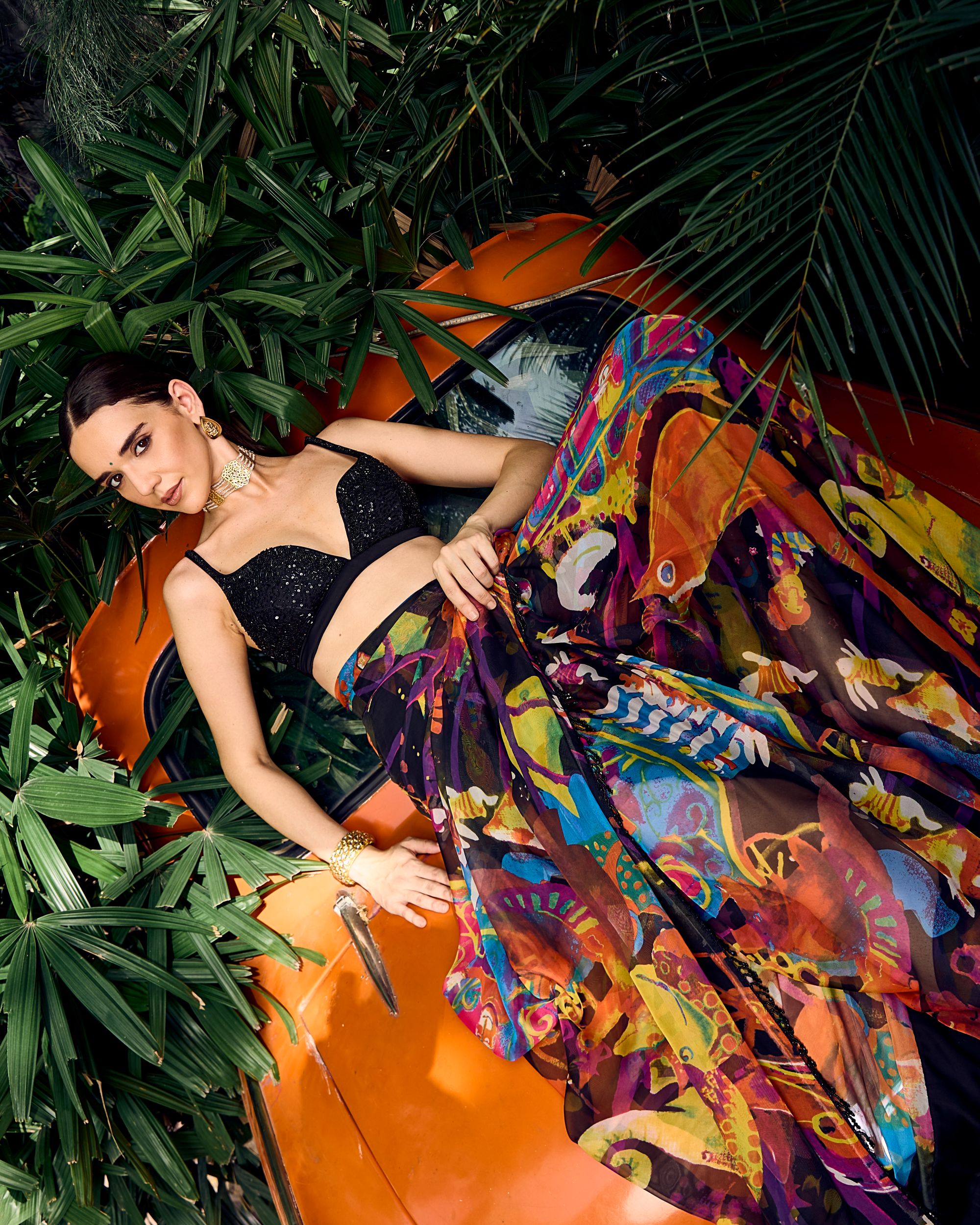 A vibrant printed flat chiffon saree with hanging lace details, paired with a black handworked blouse that adds the perfect touch of shimmer and edge. Breezy, bold, and effortlessly chic.