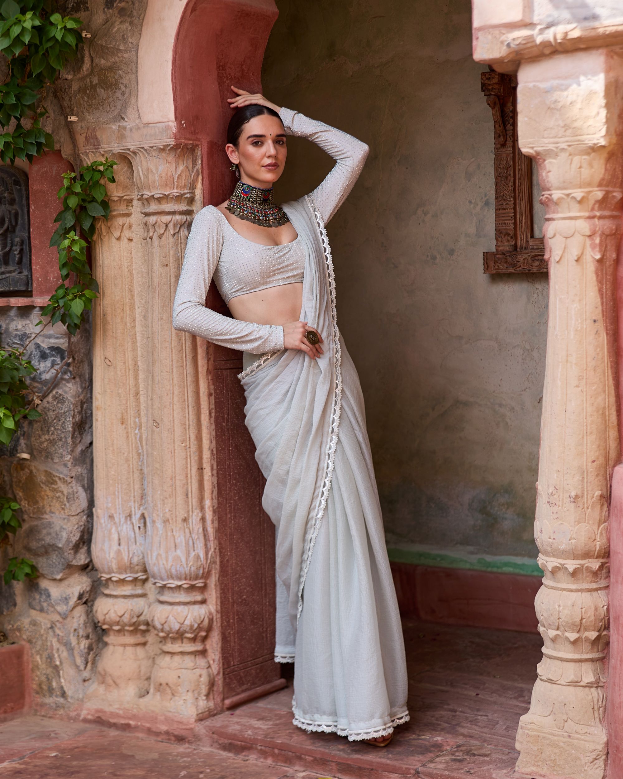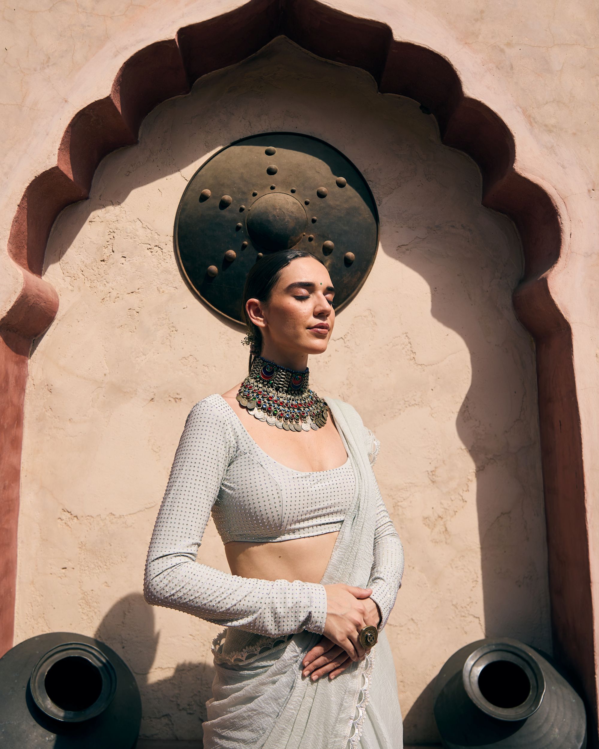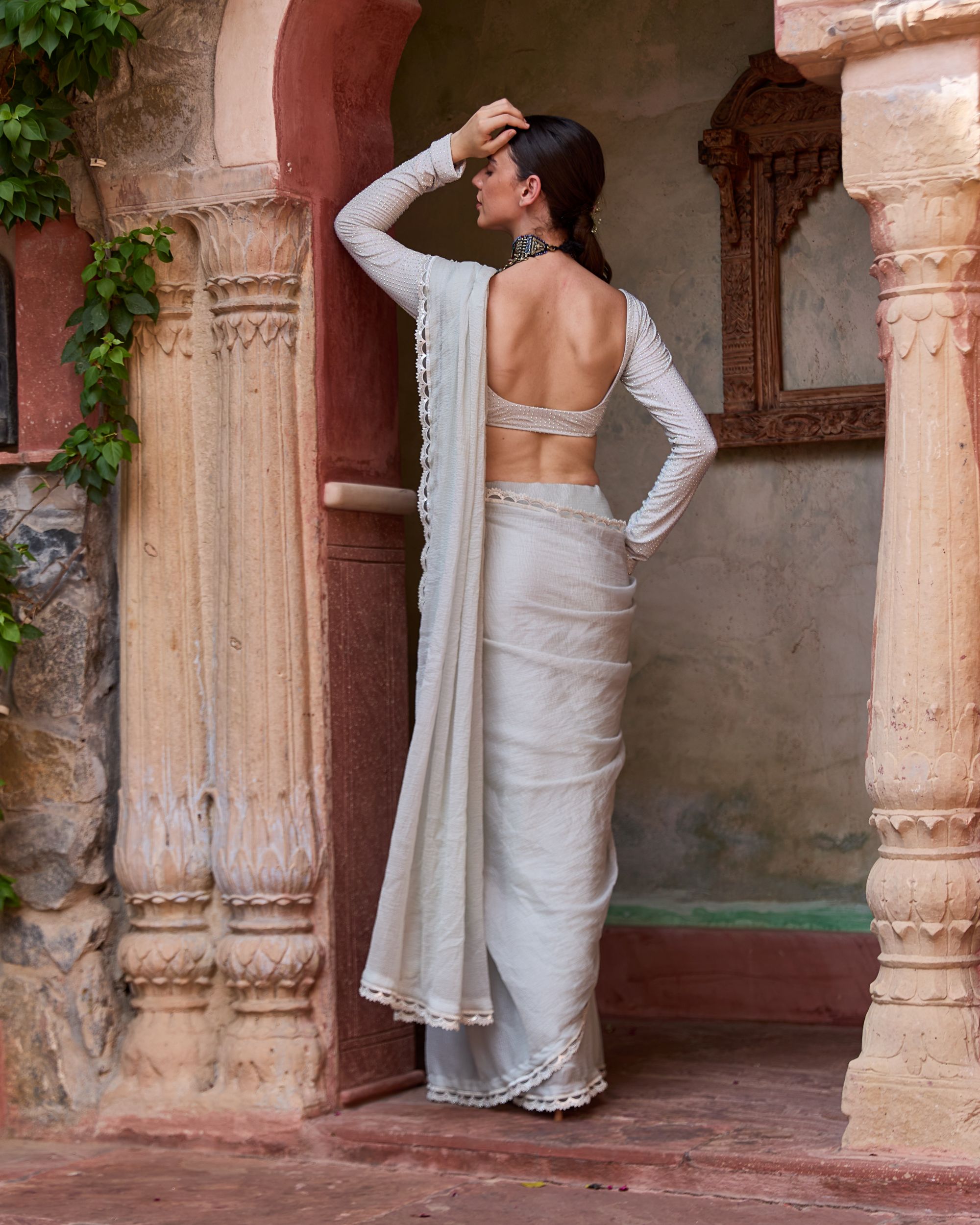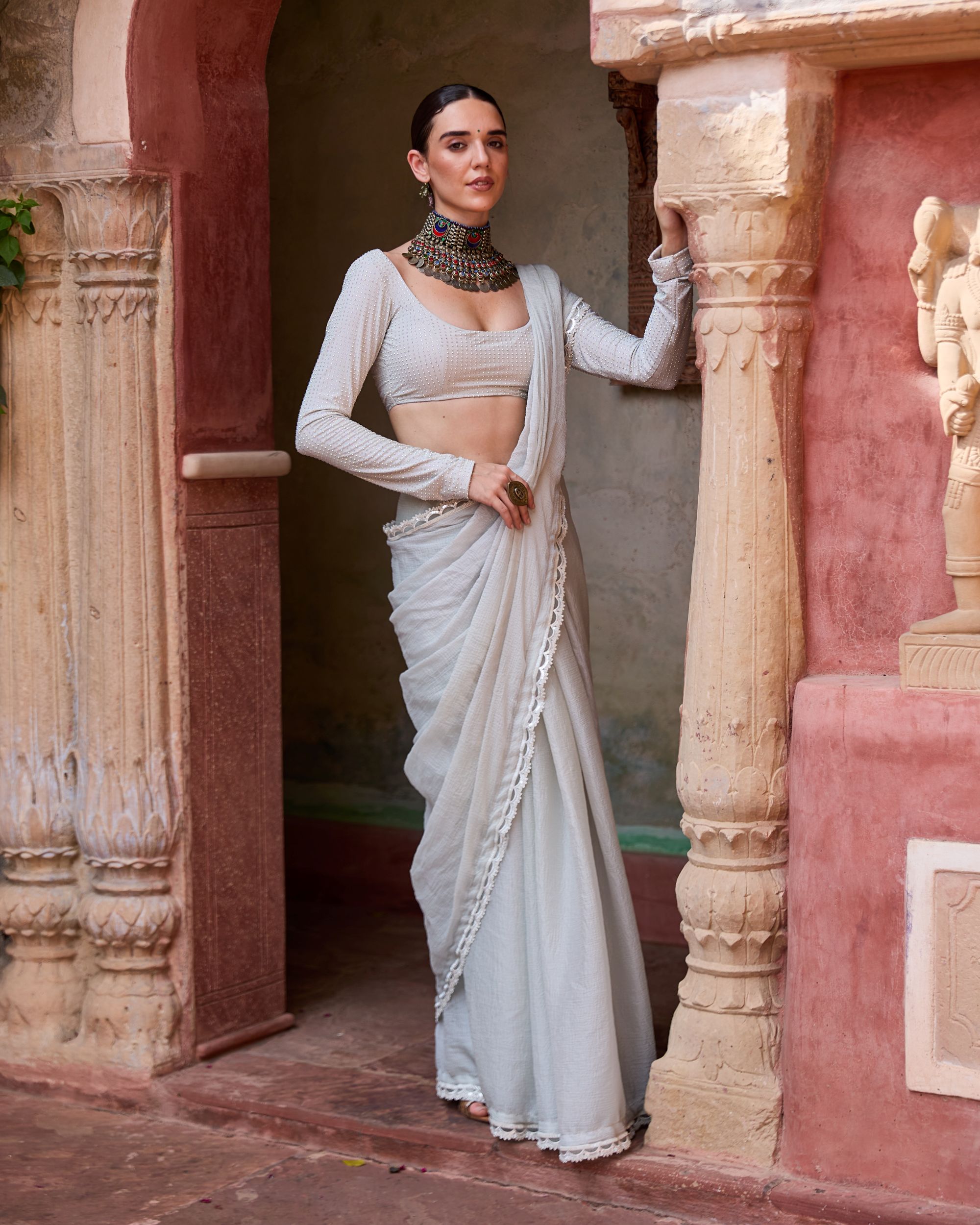 Falak Saree — a timeless beauty in ice light grey crush organza silk, featuring embellished lace borders and a rhinestone-detailed blouse. Elegant yet modern, it’s perfect for festive or heritage occasions.