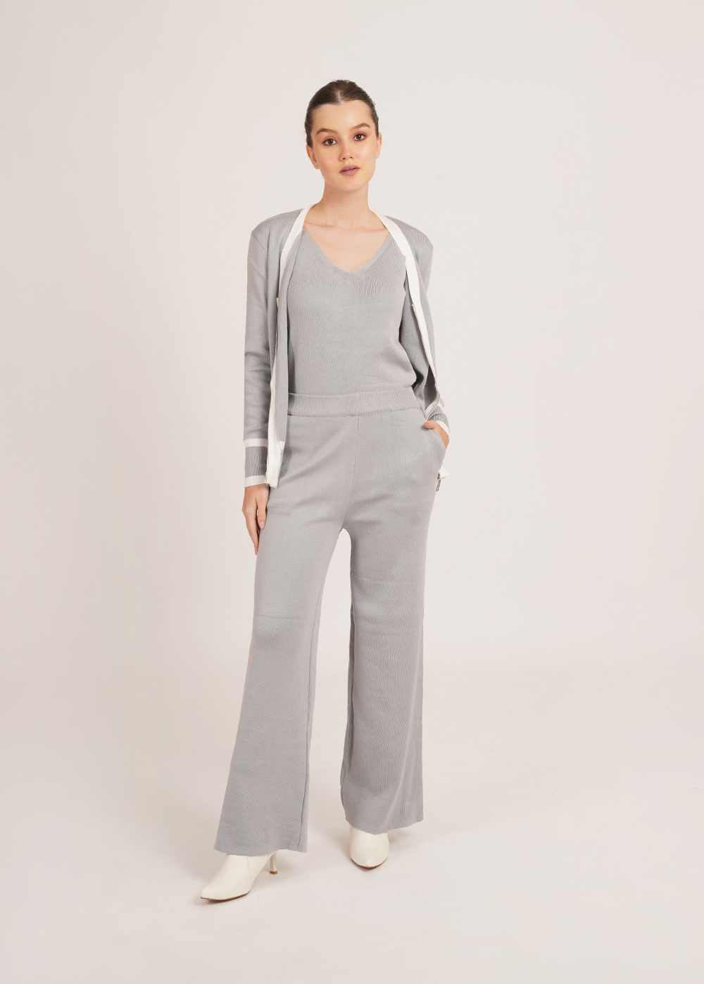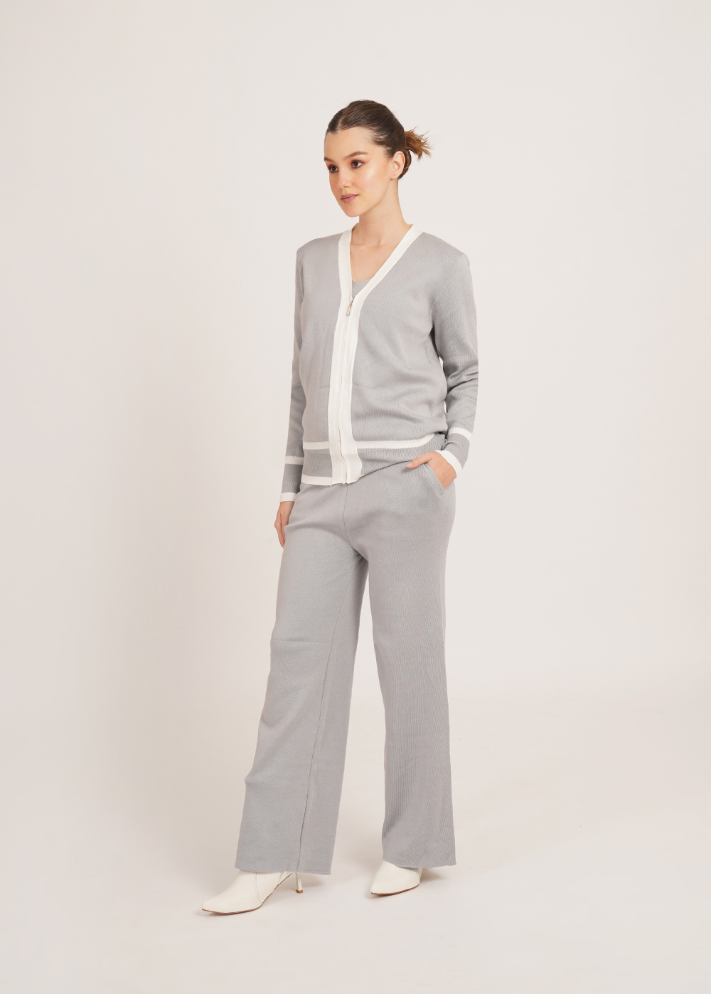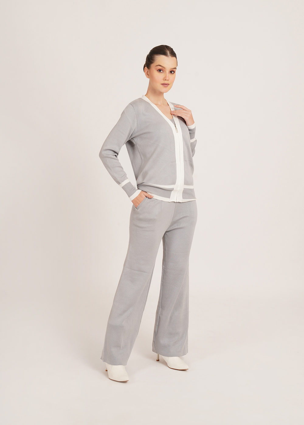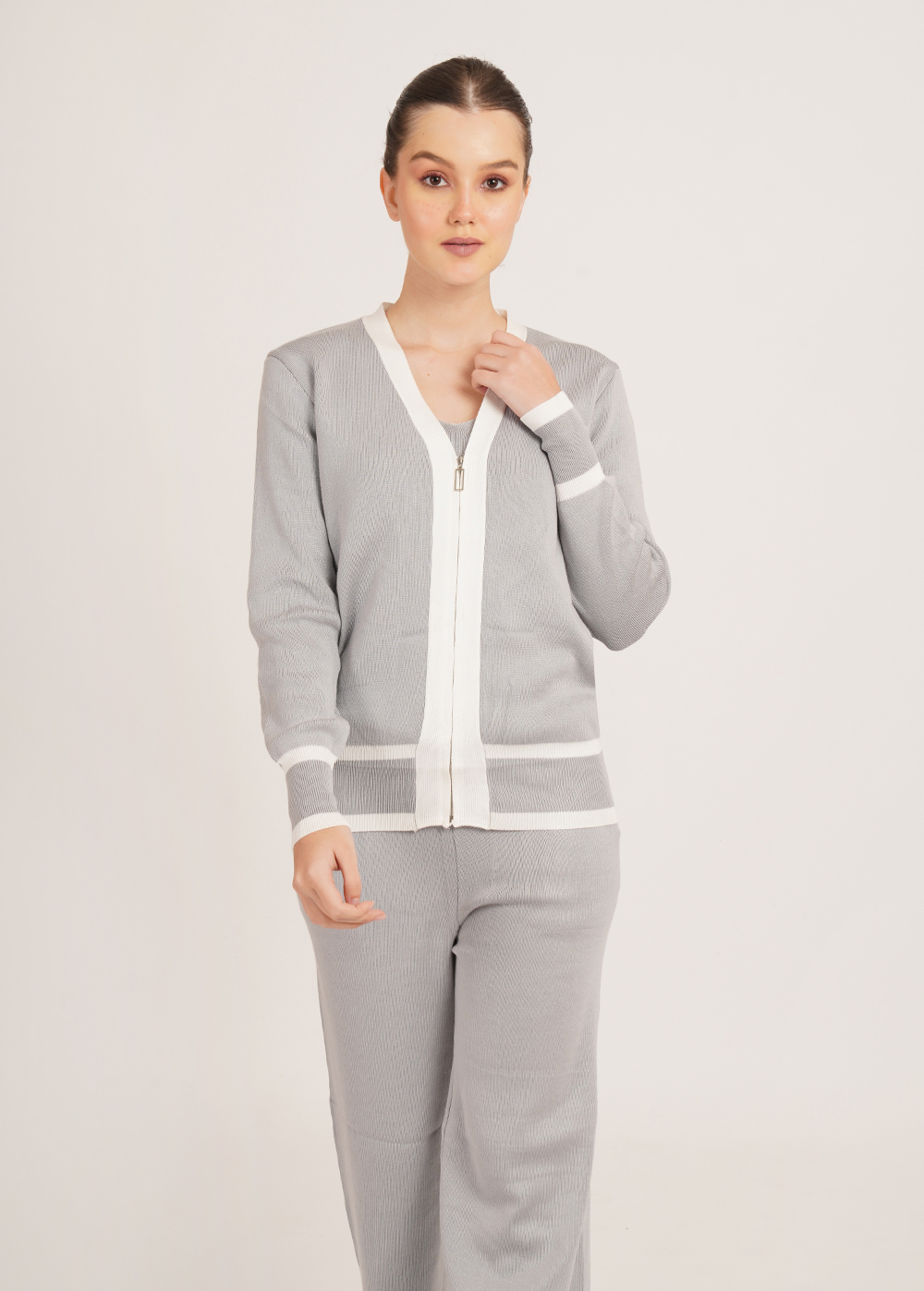 Description: Clean lines meet cosy comfort. Crafted in a soft winter knit, this coordinated set features a zip-front cardigan, inner layer, and relaxed trousers with contrast detailing for a sleek, polished look.