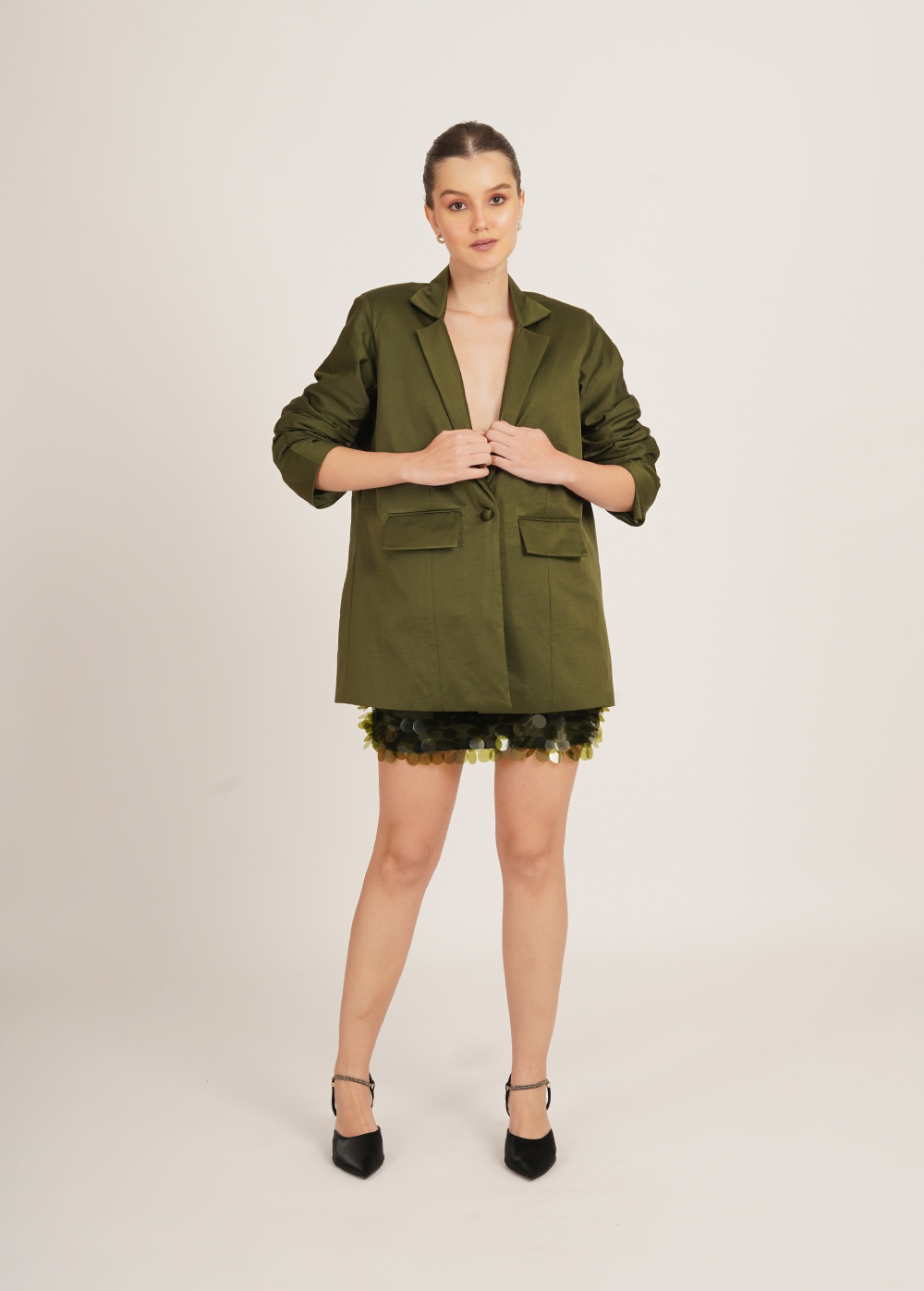 Description- A statement disc sequin mini skirt designed to add shimmer and movement, perfectly complementing the Hazelnut Blazer for a bold evening look.