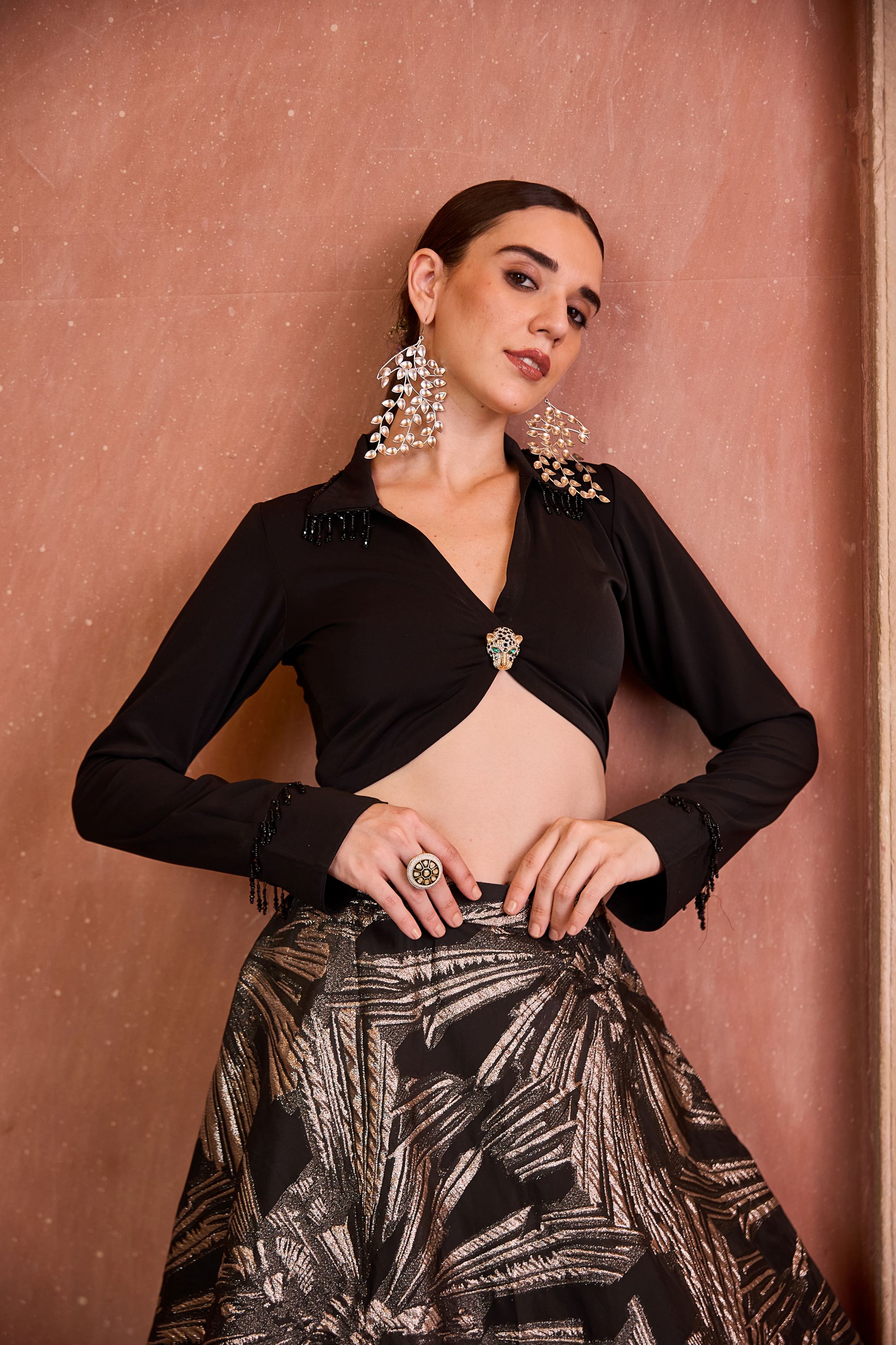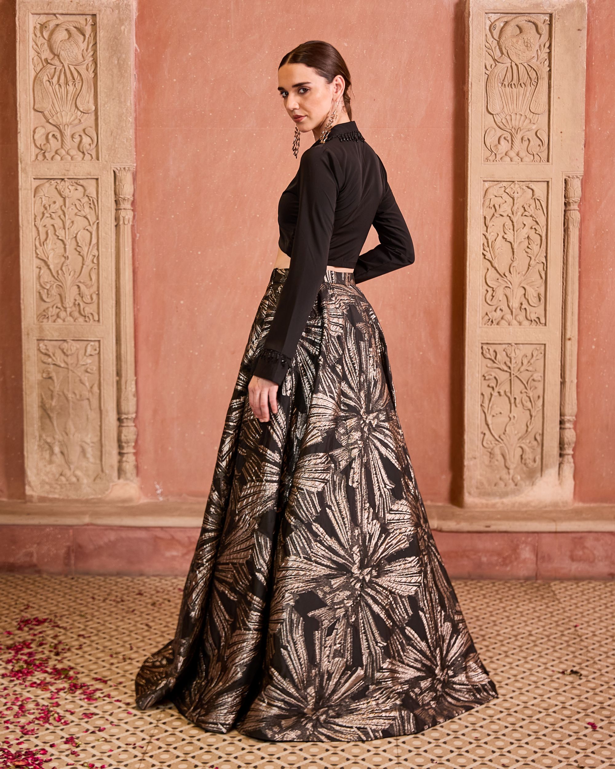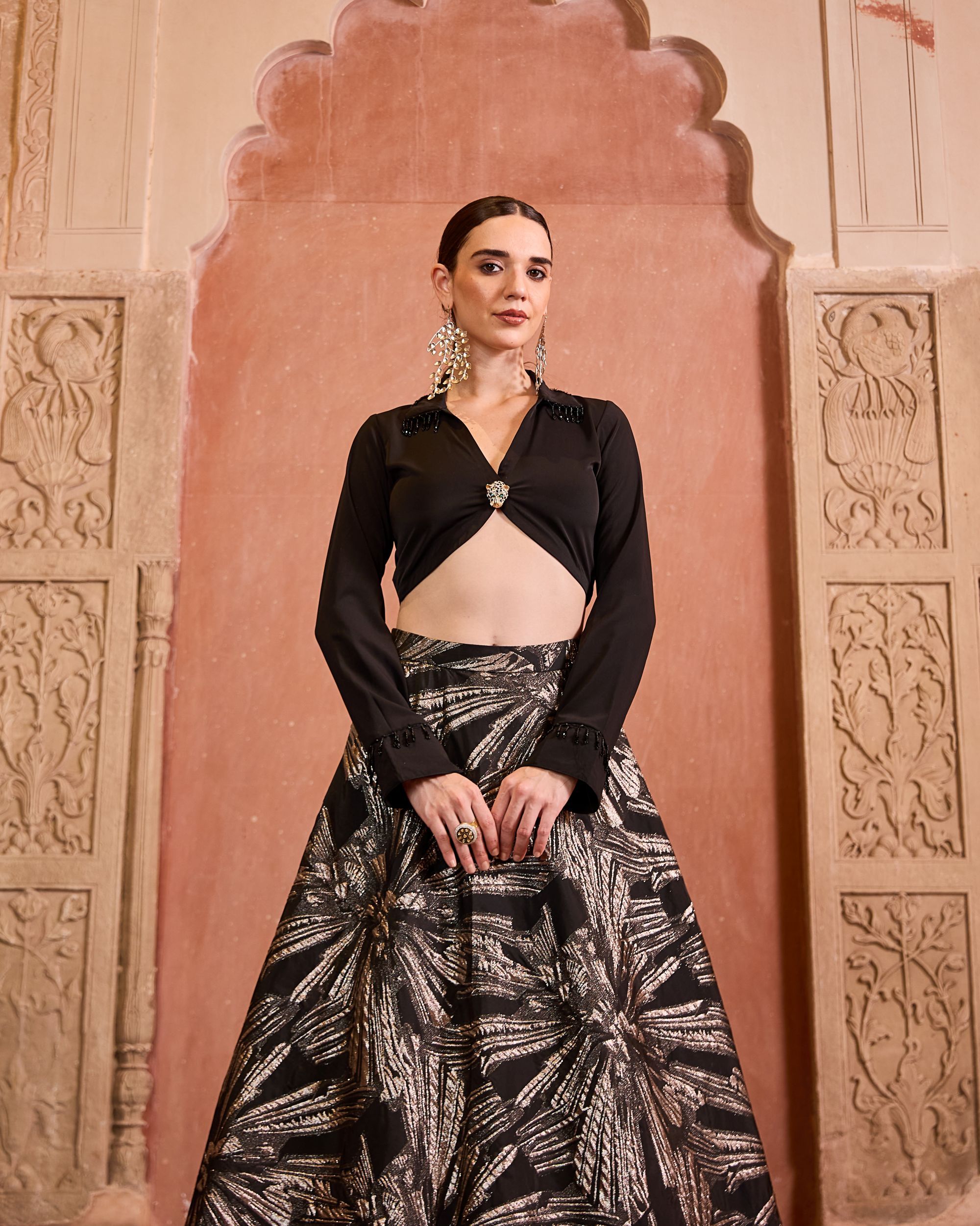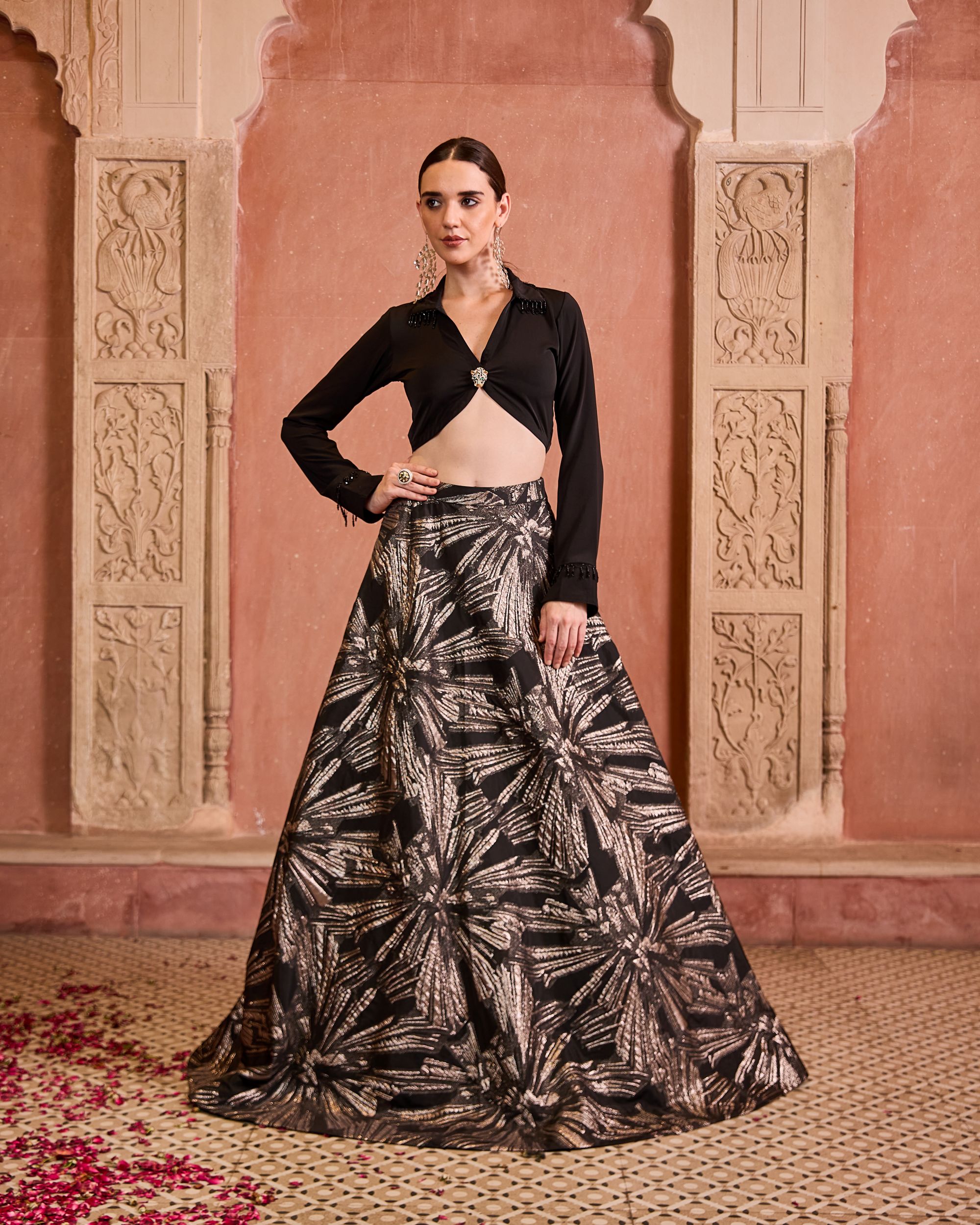 The Ishqa Set is a modern classic featuring a black organza skirt with silver foil detailing, paired with a chic black shirt with hanging accents. Striking yet effortless, it’s perfect for evening celebrations.