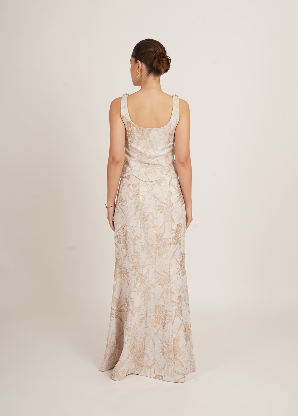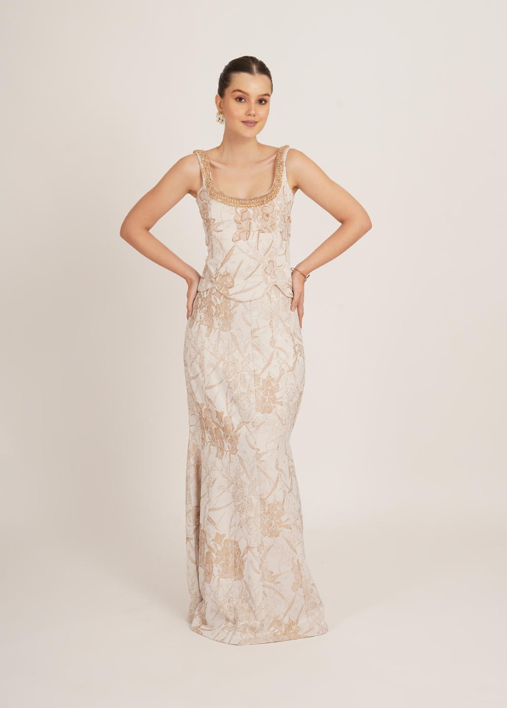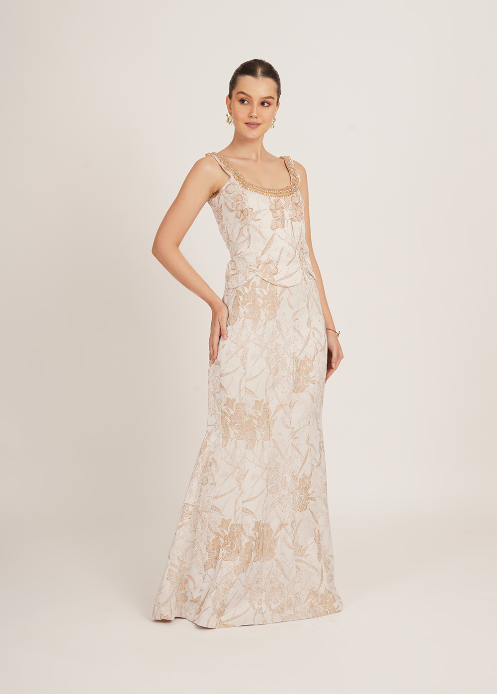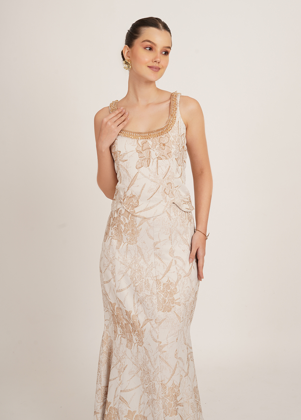 Sunheri set is an elegant two-piece outfit featuring a fitted corset top with a beaded scoop neckline and a matching floor-length skirt in ivory with a gold floral pattern, creating a refined and timeless look.
