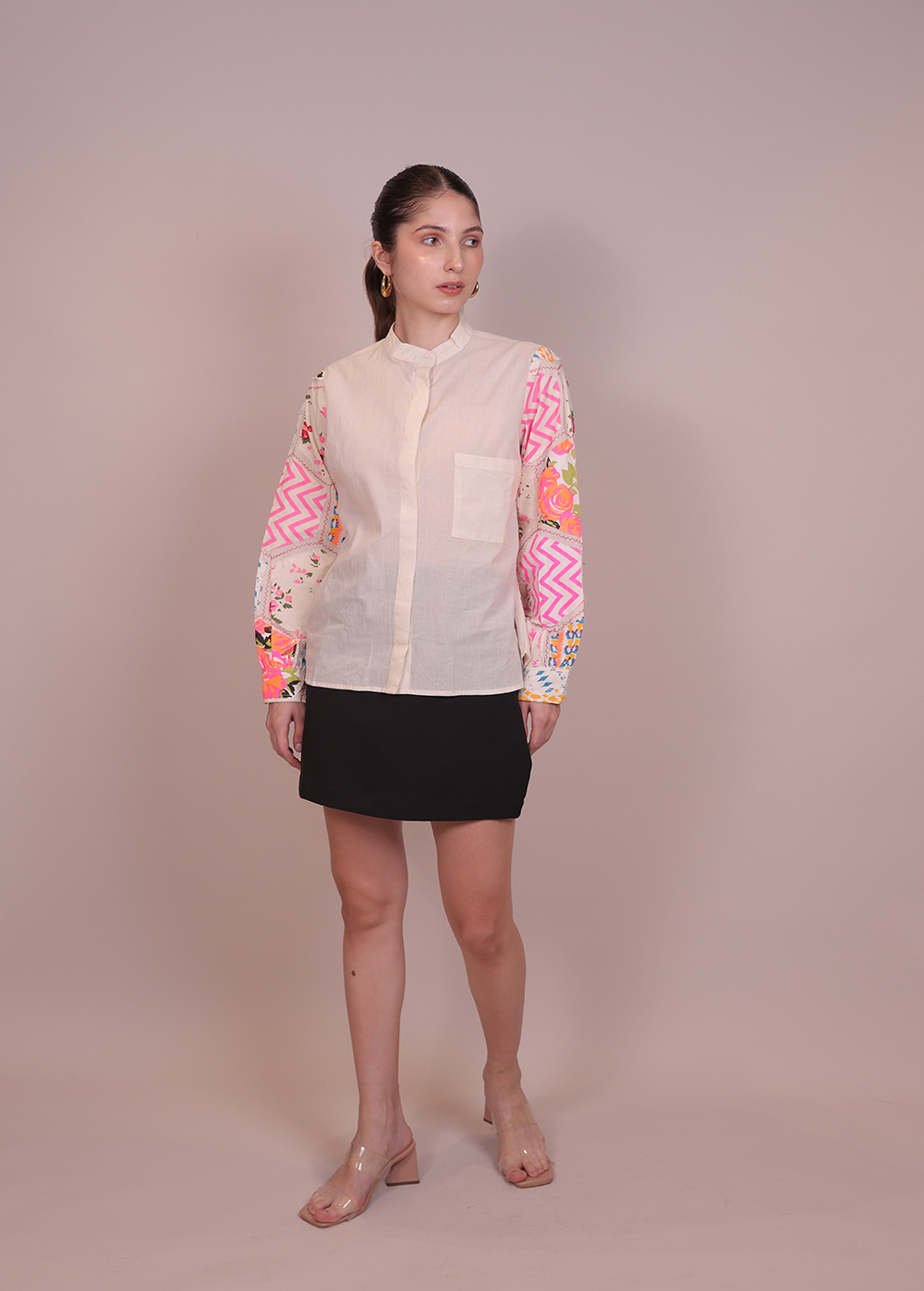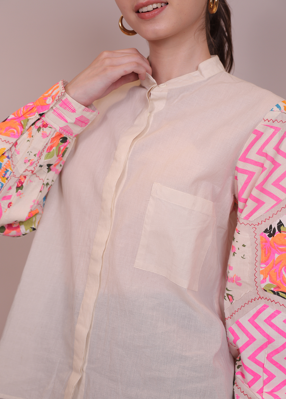 A light and breathable cotton shirt designed for summer comfort. The contrast patchwork sleeves add a fun pop of color, making the look stylish and unique.