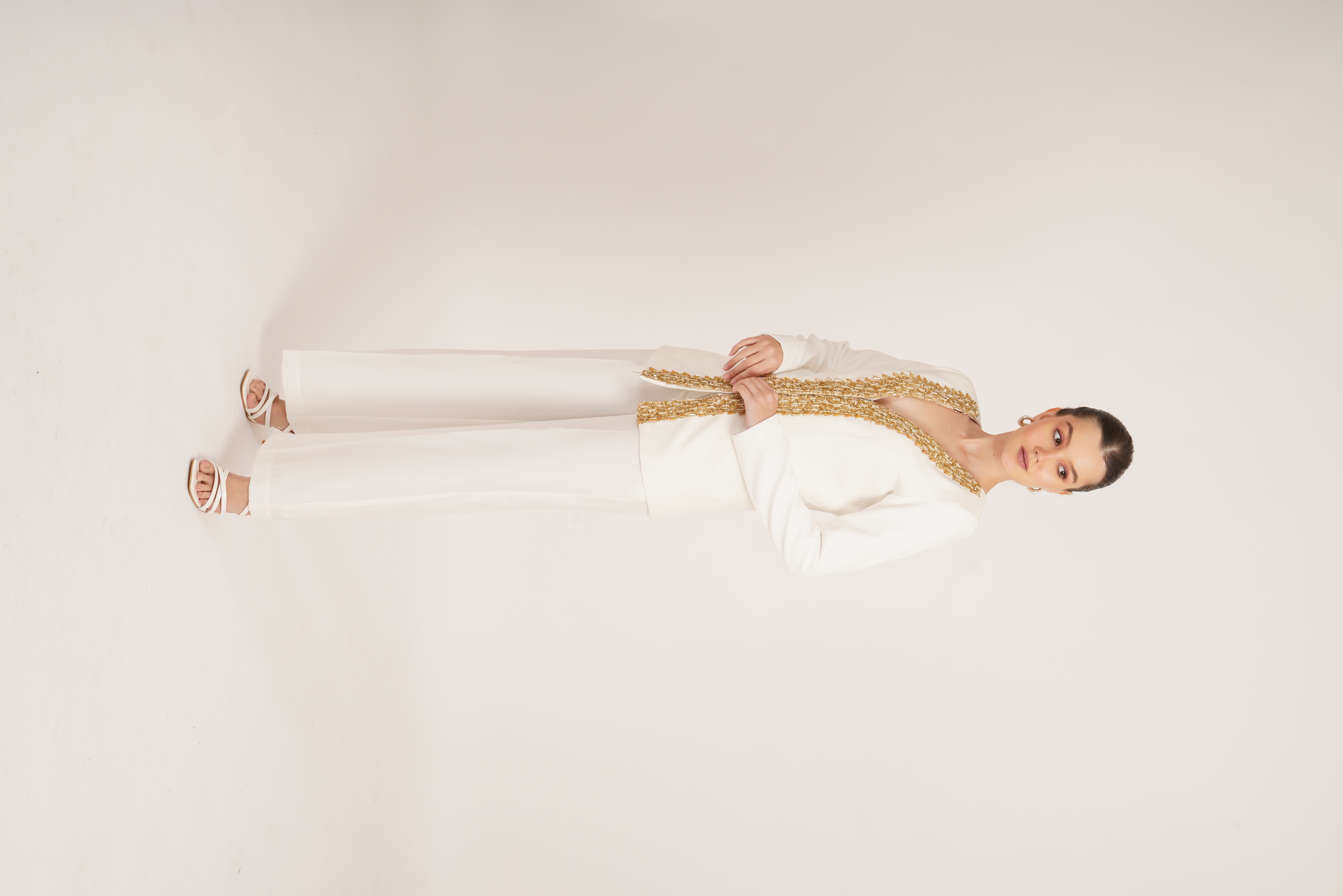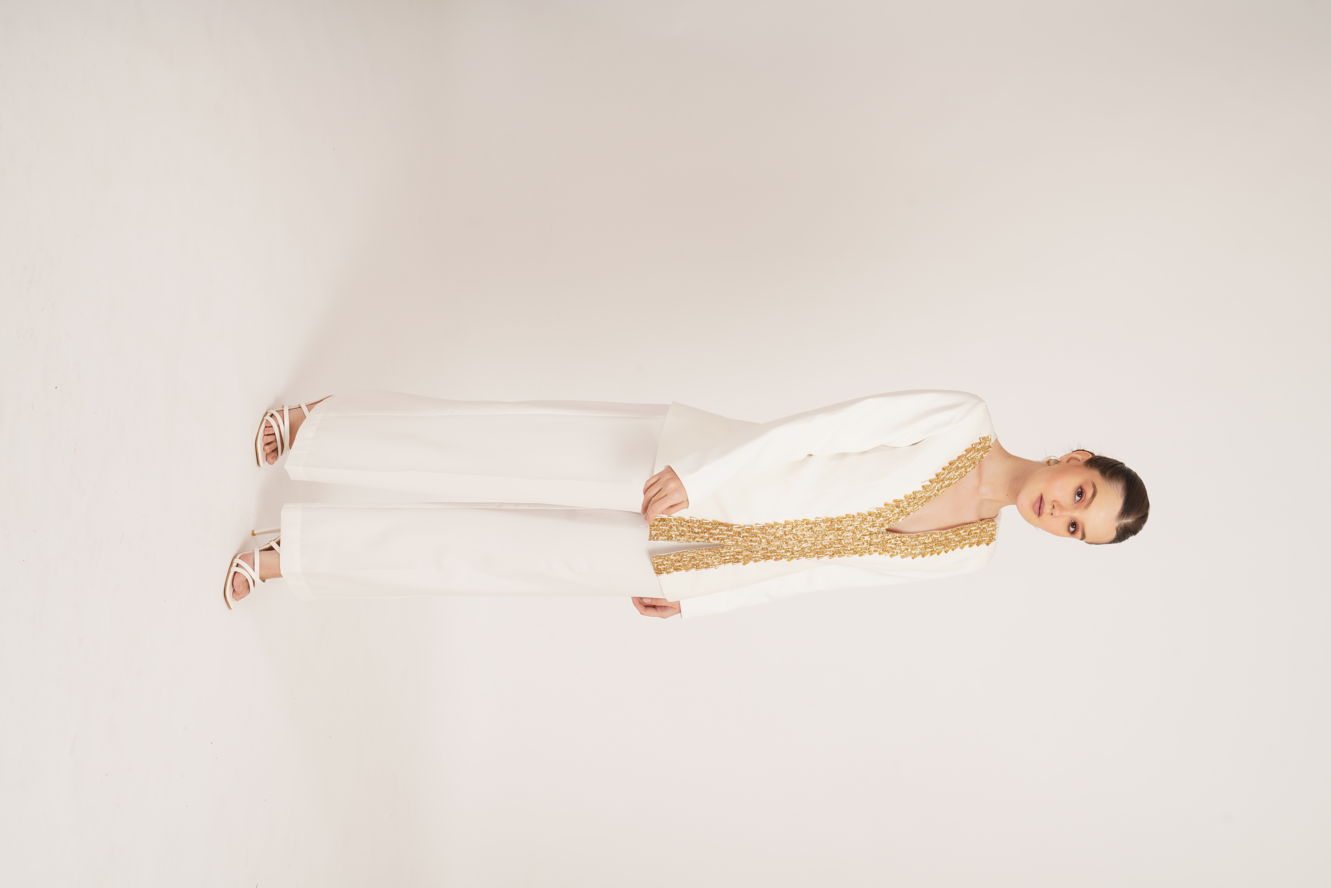Elegant and effortless, the Kahwahish Set features a classic white silhouette adorned with intricate gold handwork detailing. Paired with flared pants, it's perfect for festive evenings or a classy night out.