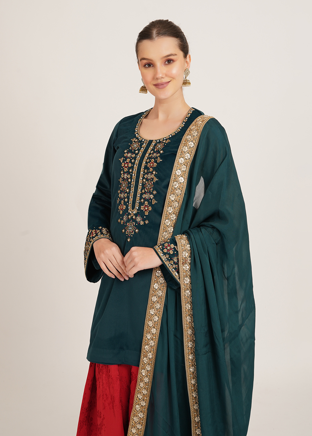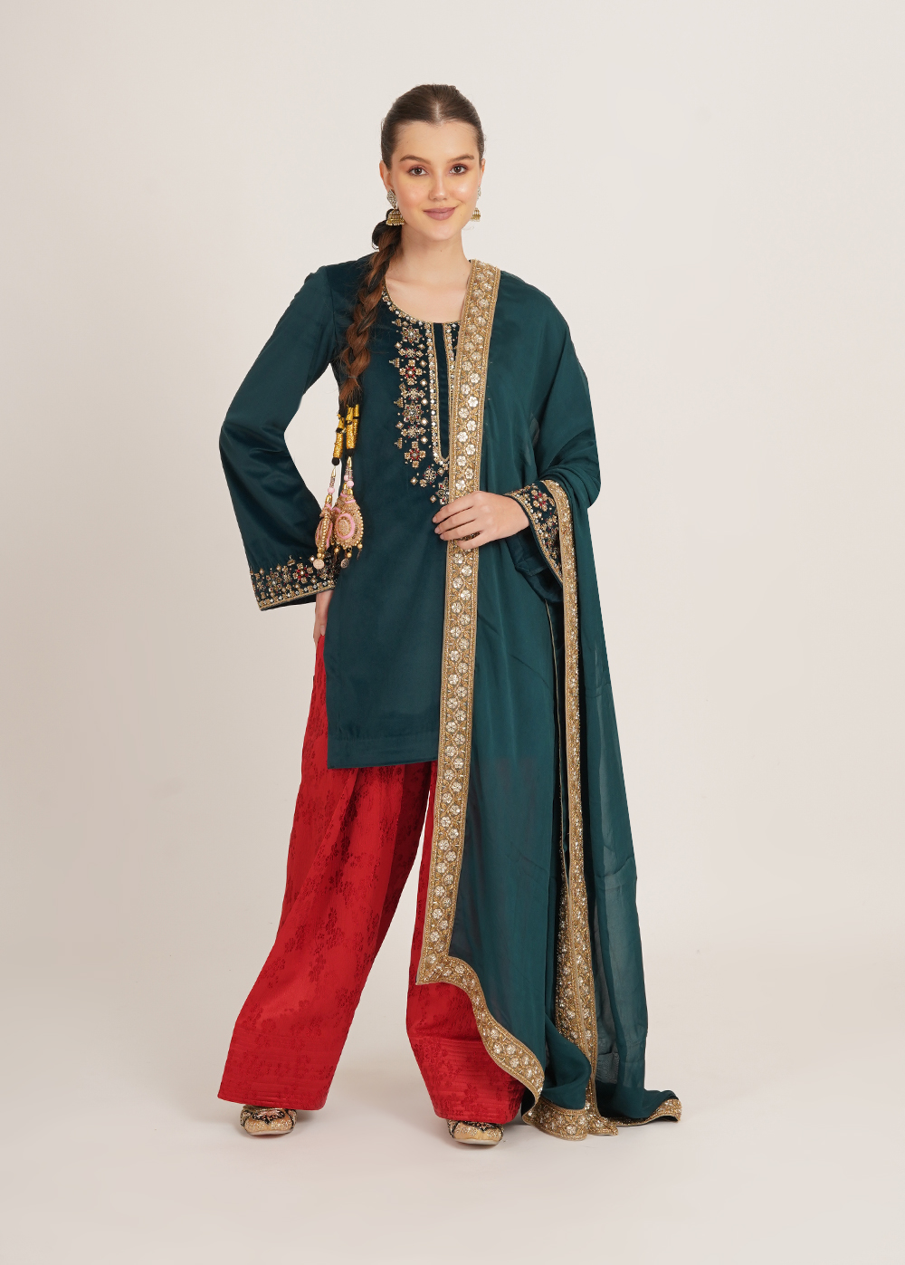Color- Shirt & Dupatta- Teal Blue, Farsi- Red