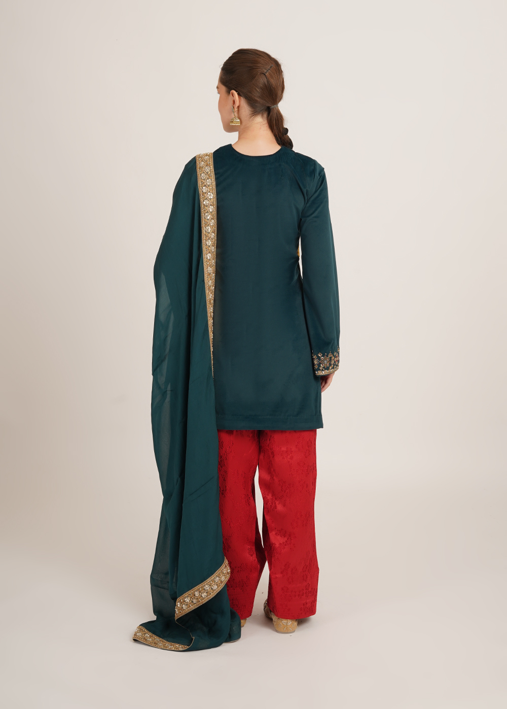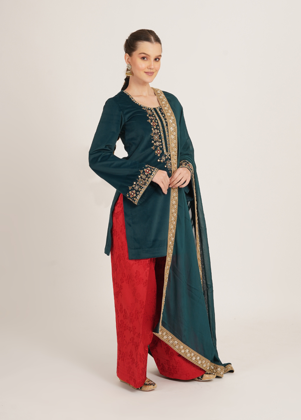 Description- Crafted in luxurious sandwashed velvet, the Manpreet Farsi salwar set features delicate handwork on the shirt, paired with an embellished organza dupatta for a refined festive finish.