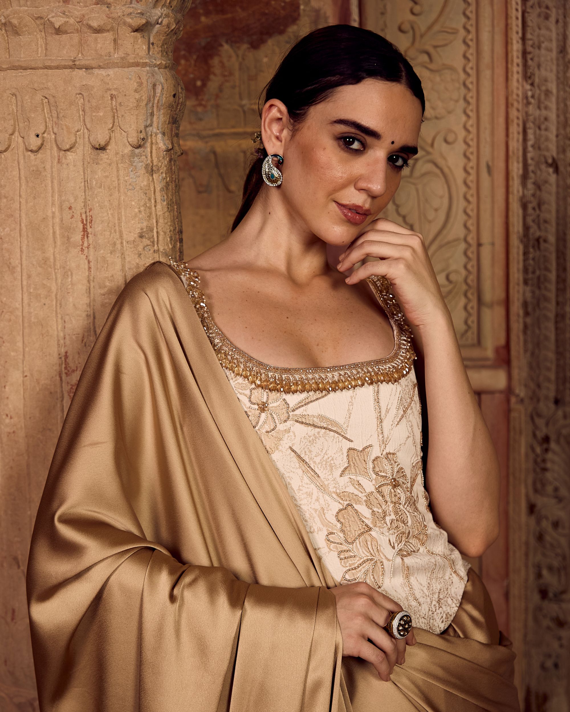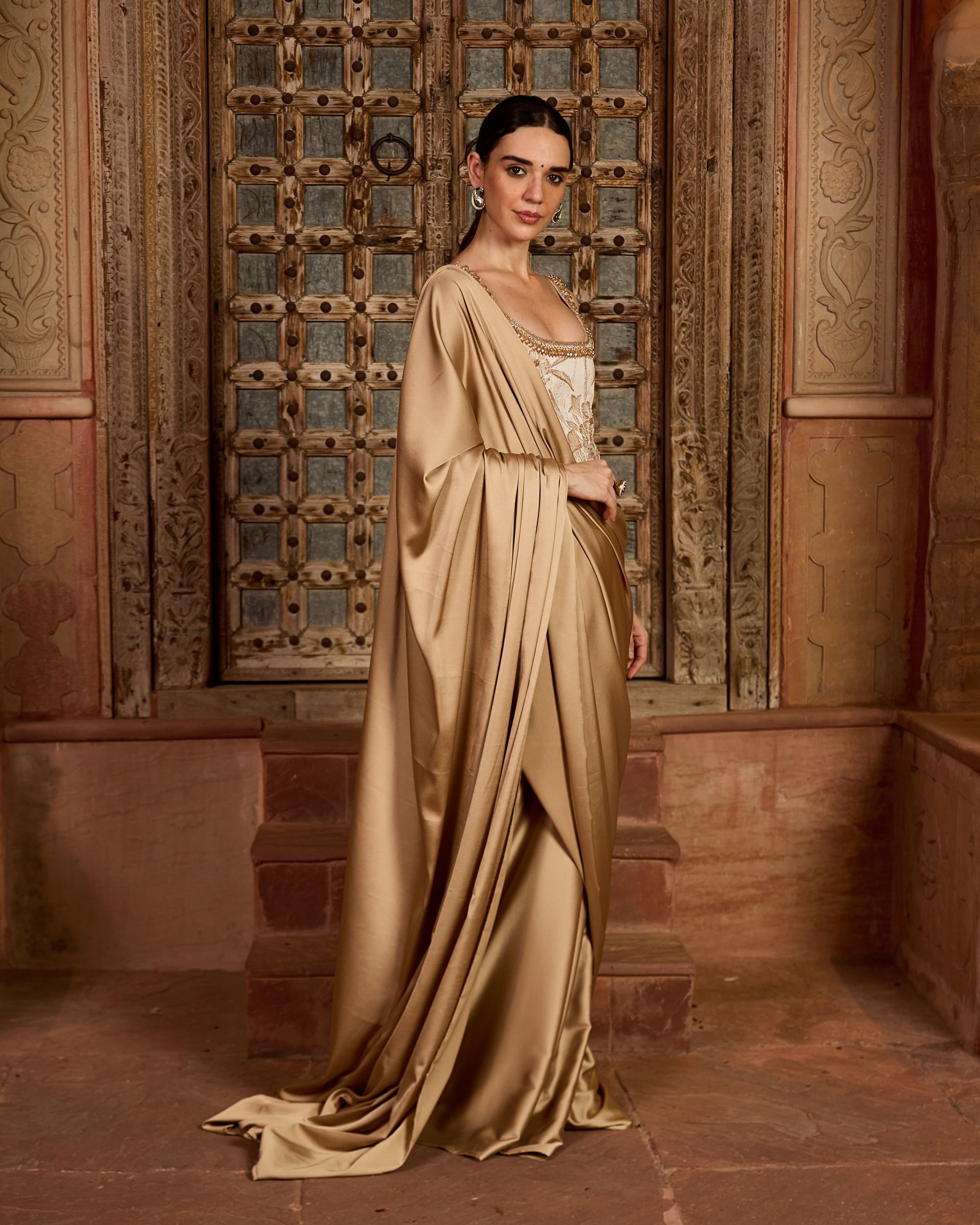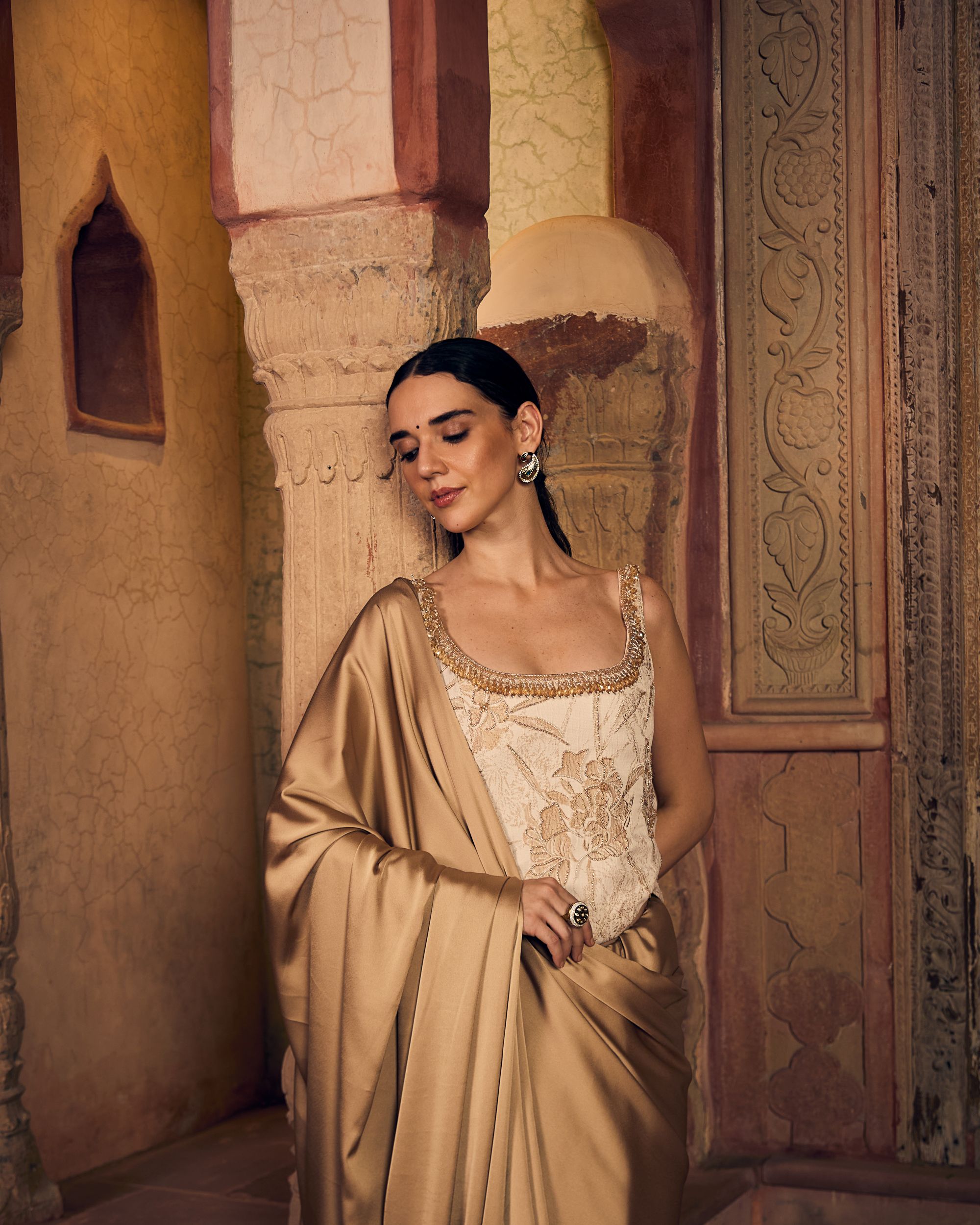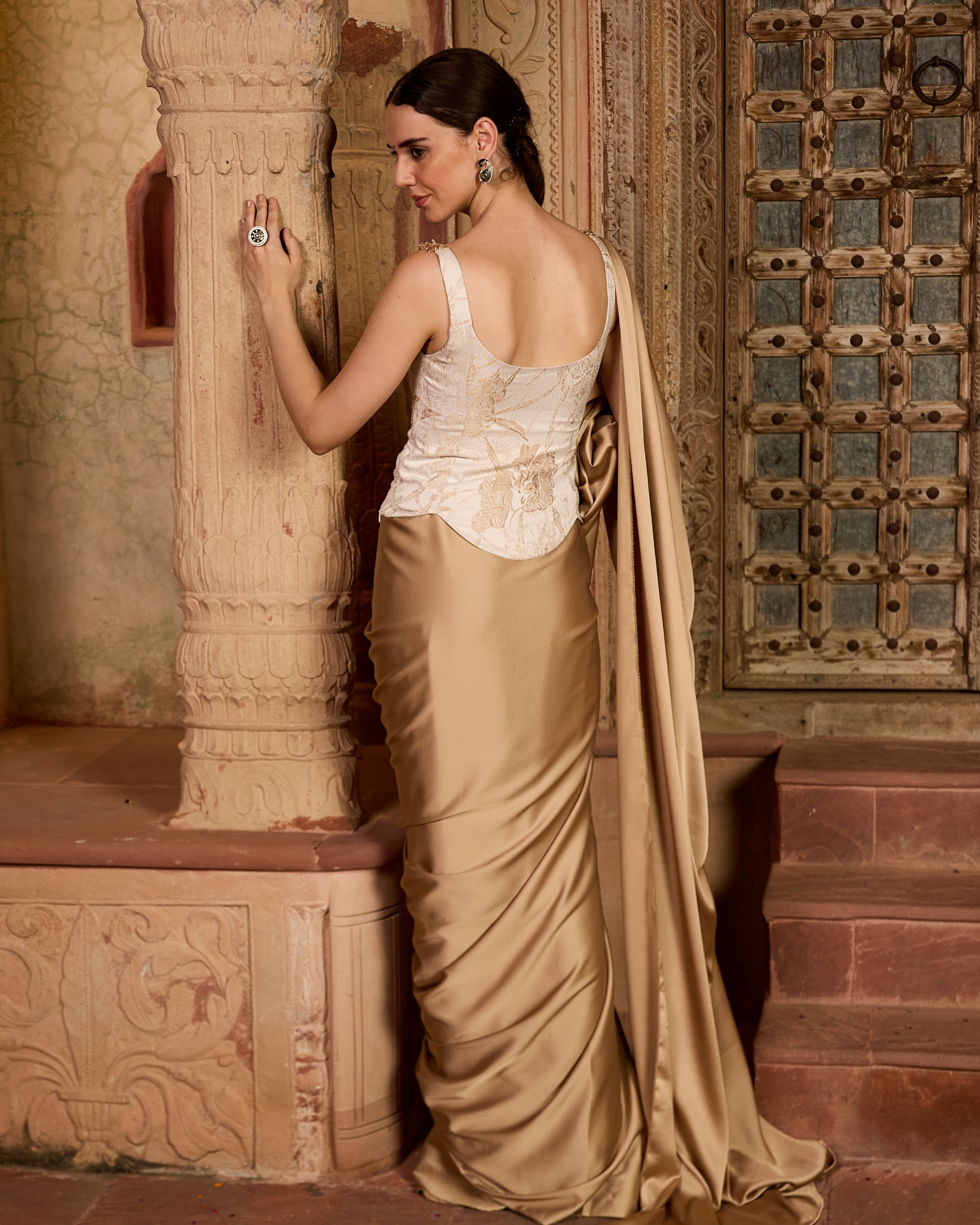 A luxurious satin gold saree with elegant hanging lace details, paired with a corseted brocade blouse embellished in intricate handwork. Regal, refined, and effortlessly glamorous.