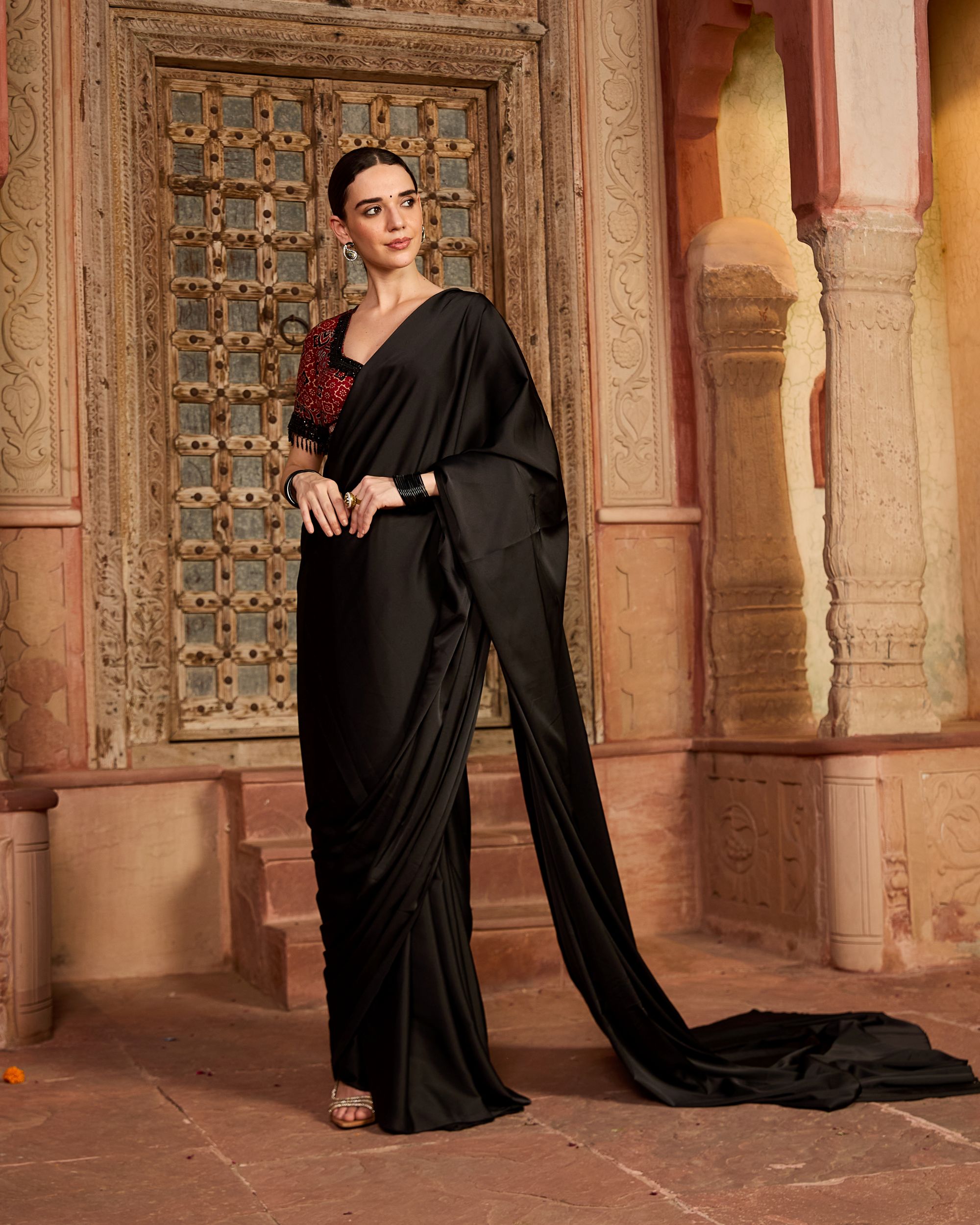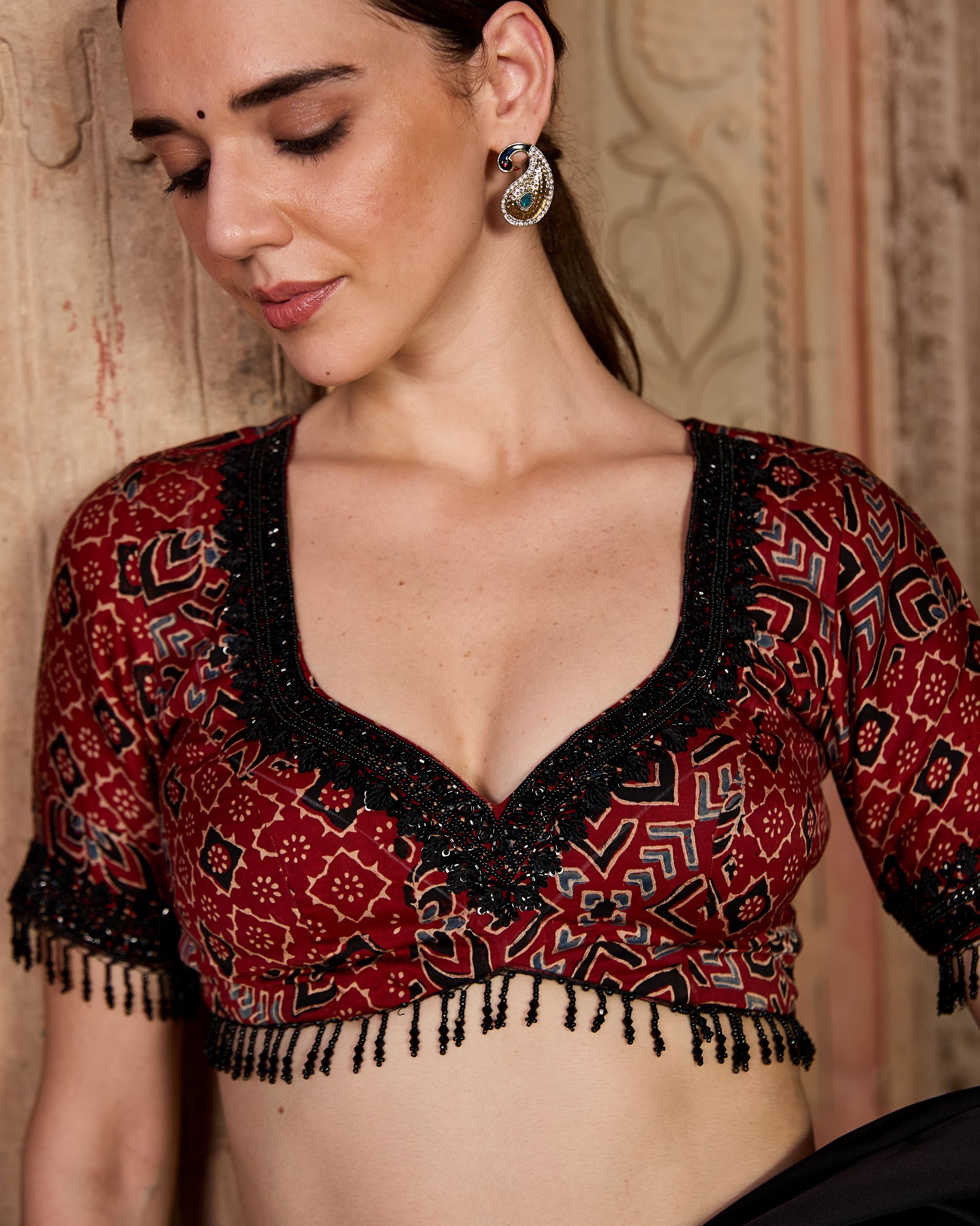 A timeless black drape paired with an Ajrakh-printed blouse adorned in black handwork and beaded lace hangings. Elegant, bold, and rooted in heritage.