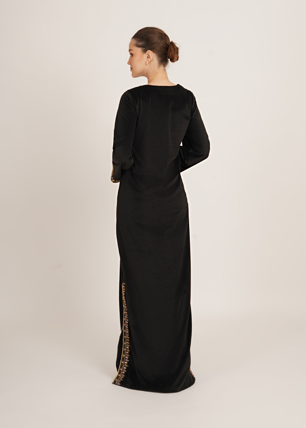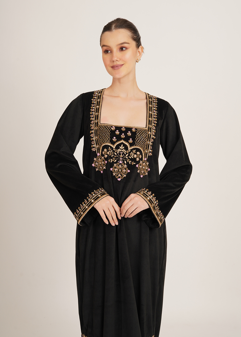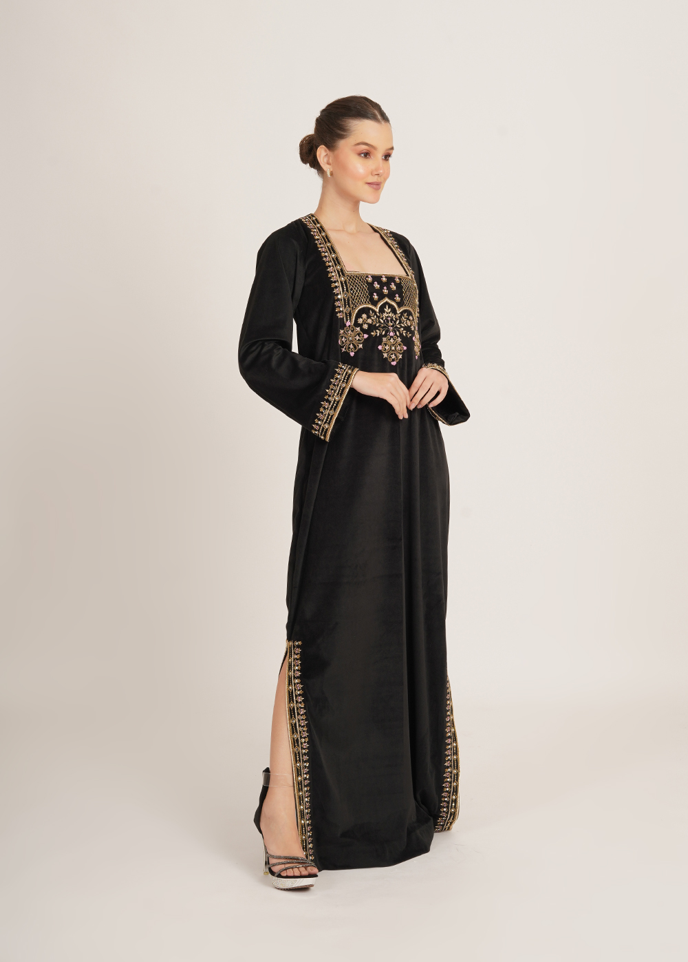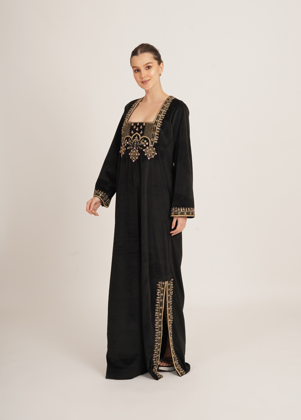 Description- A statement kaftaan crafted in luxurious imported velvet, featuring intricate handwork and sleek side slits that add effortless elegance and movement.