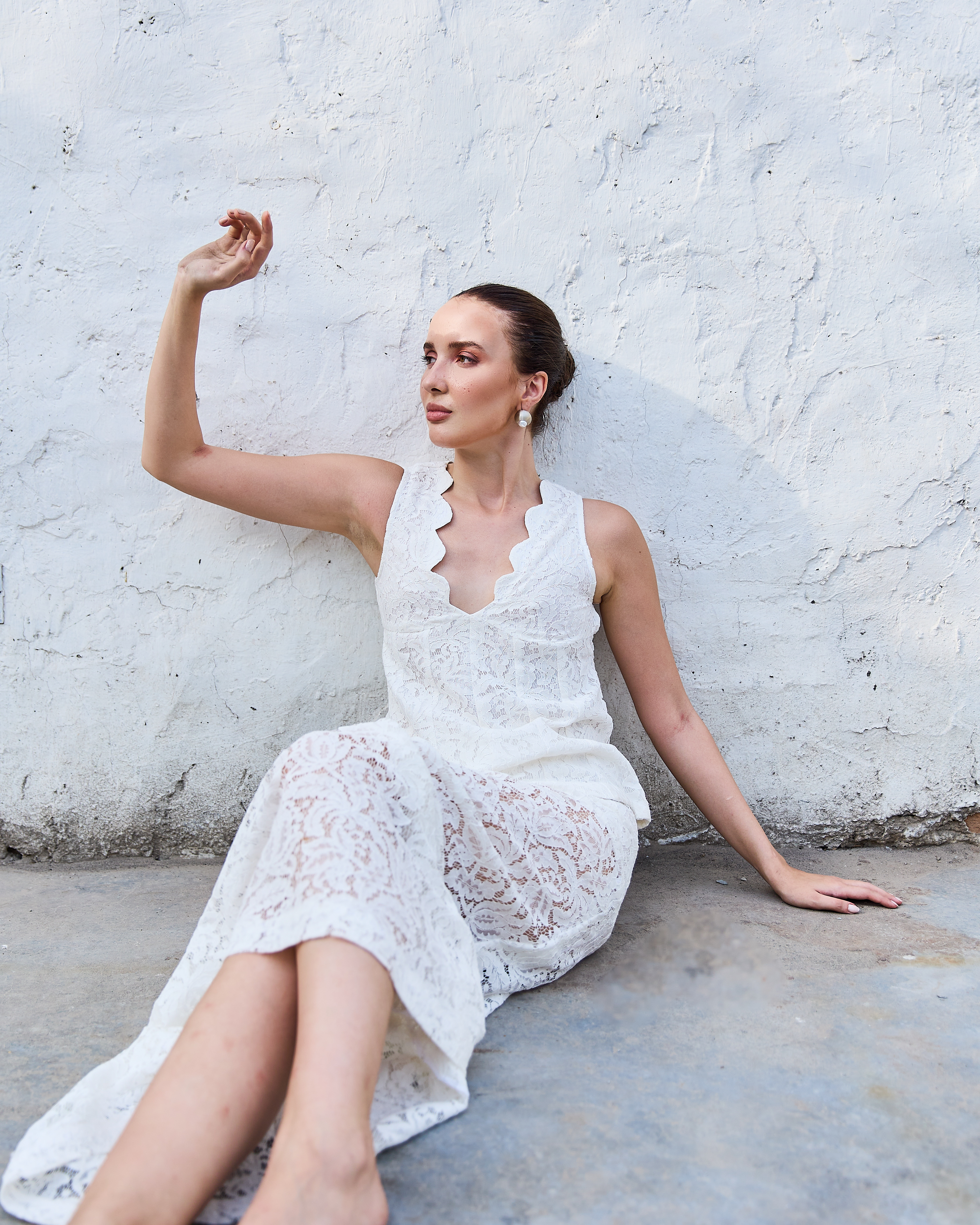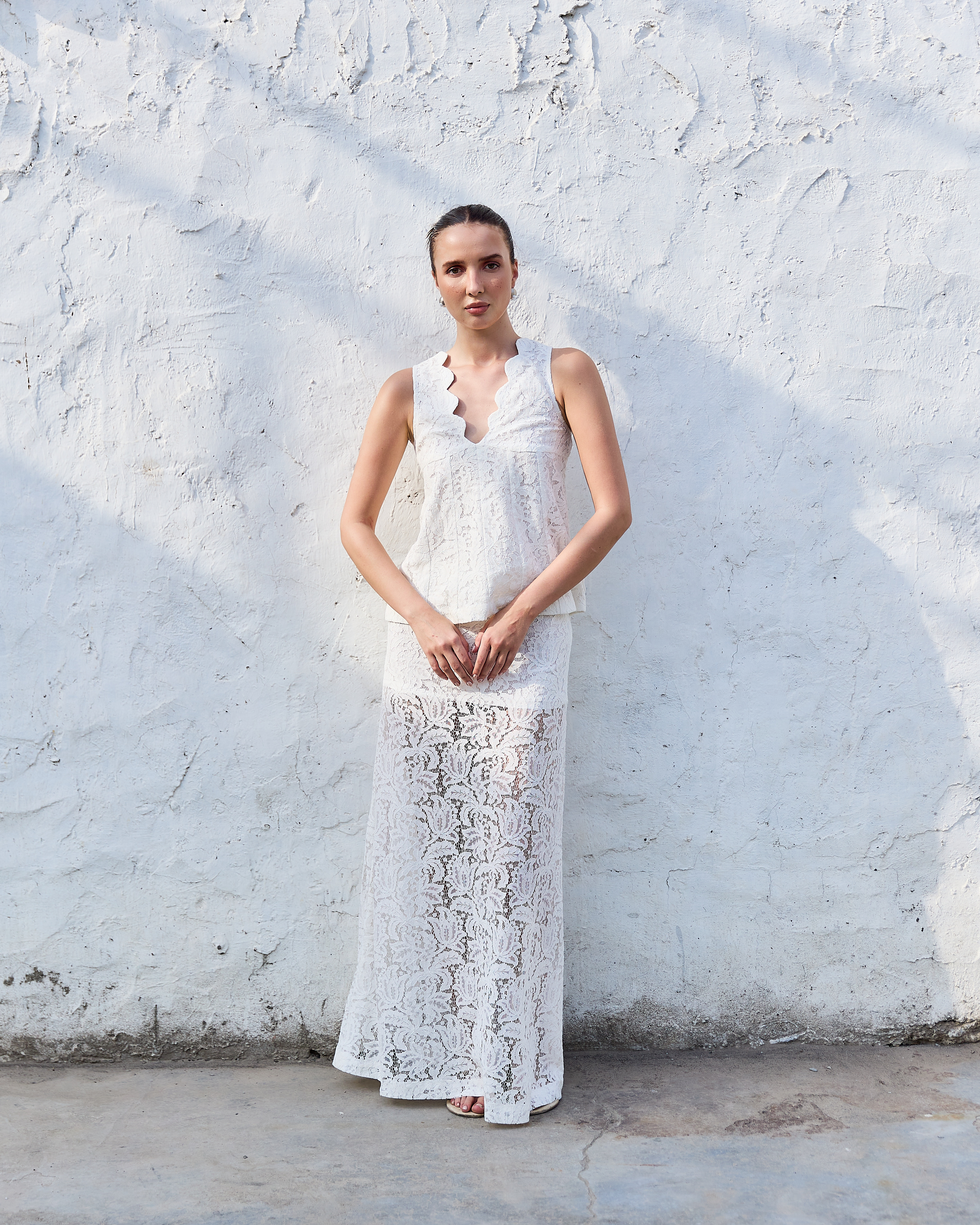 A delicate lace co-ord set featuring a sleeveless top with a scalloped neckline and a matching straight-fit skirt. Feminine, textured, and effortlessly elegant with a soft, romantic appeal.