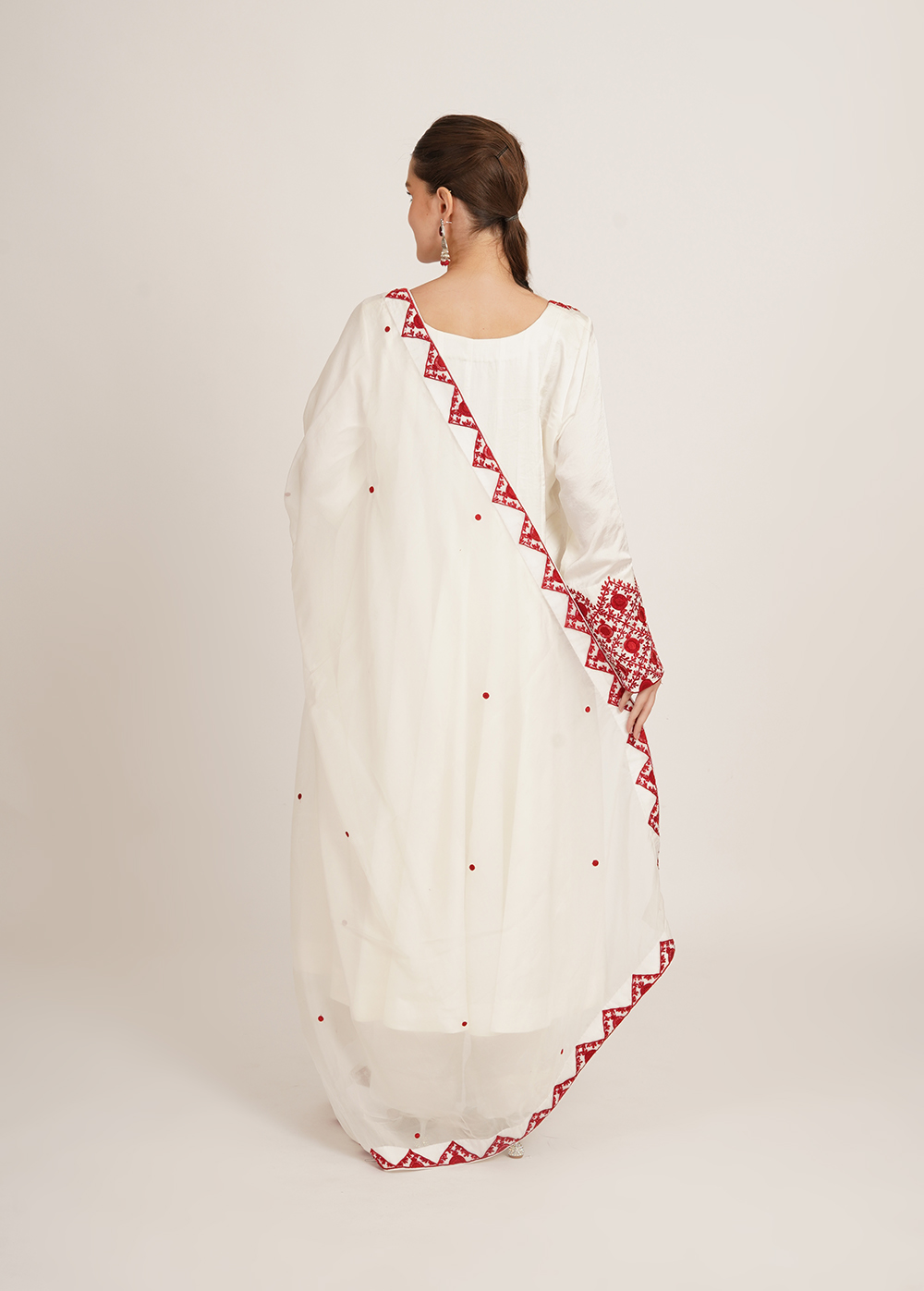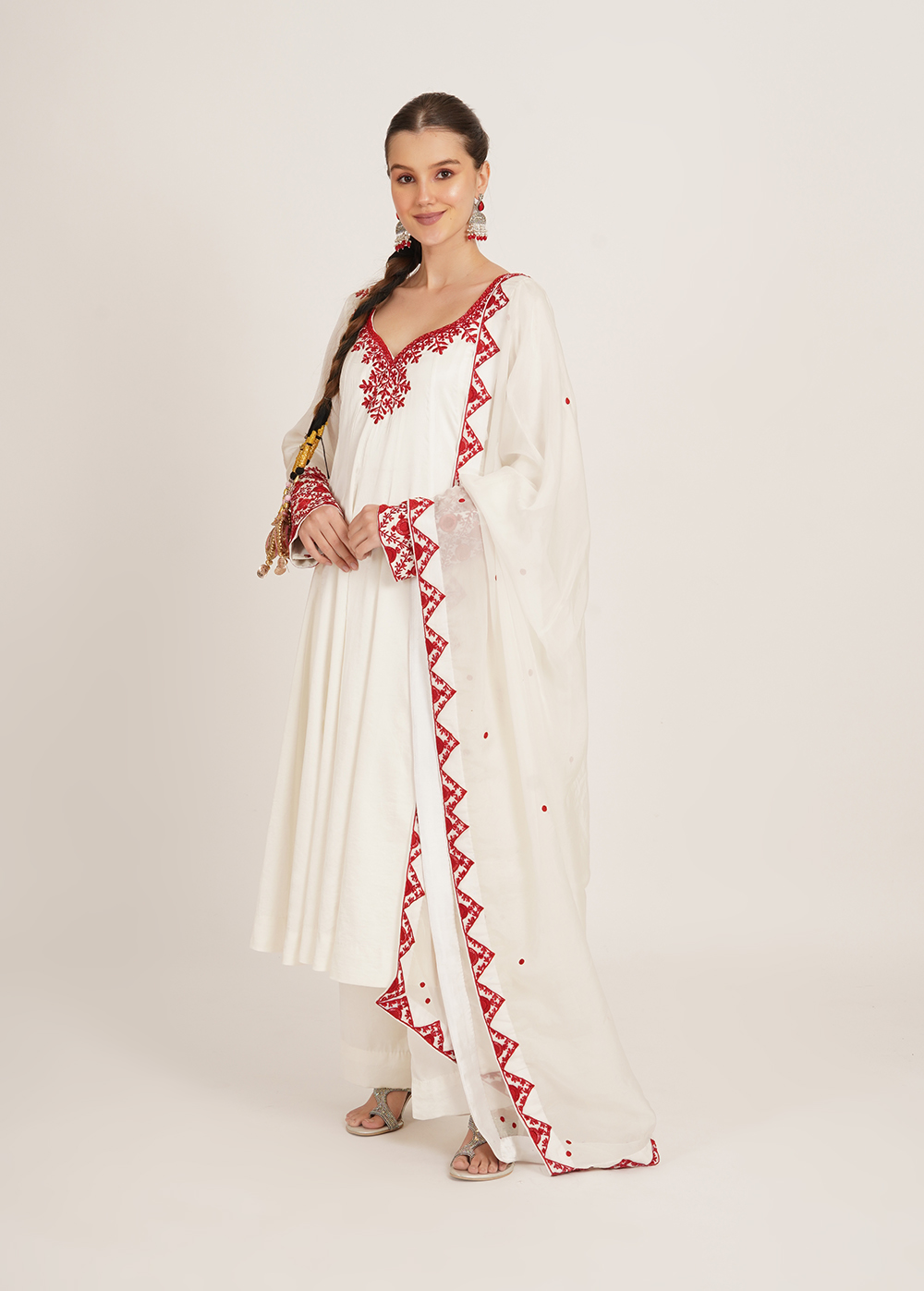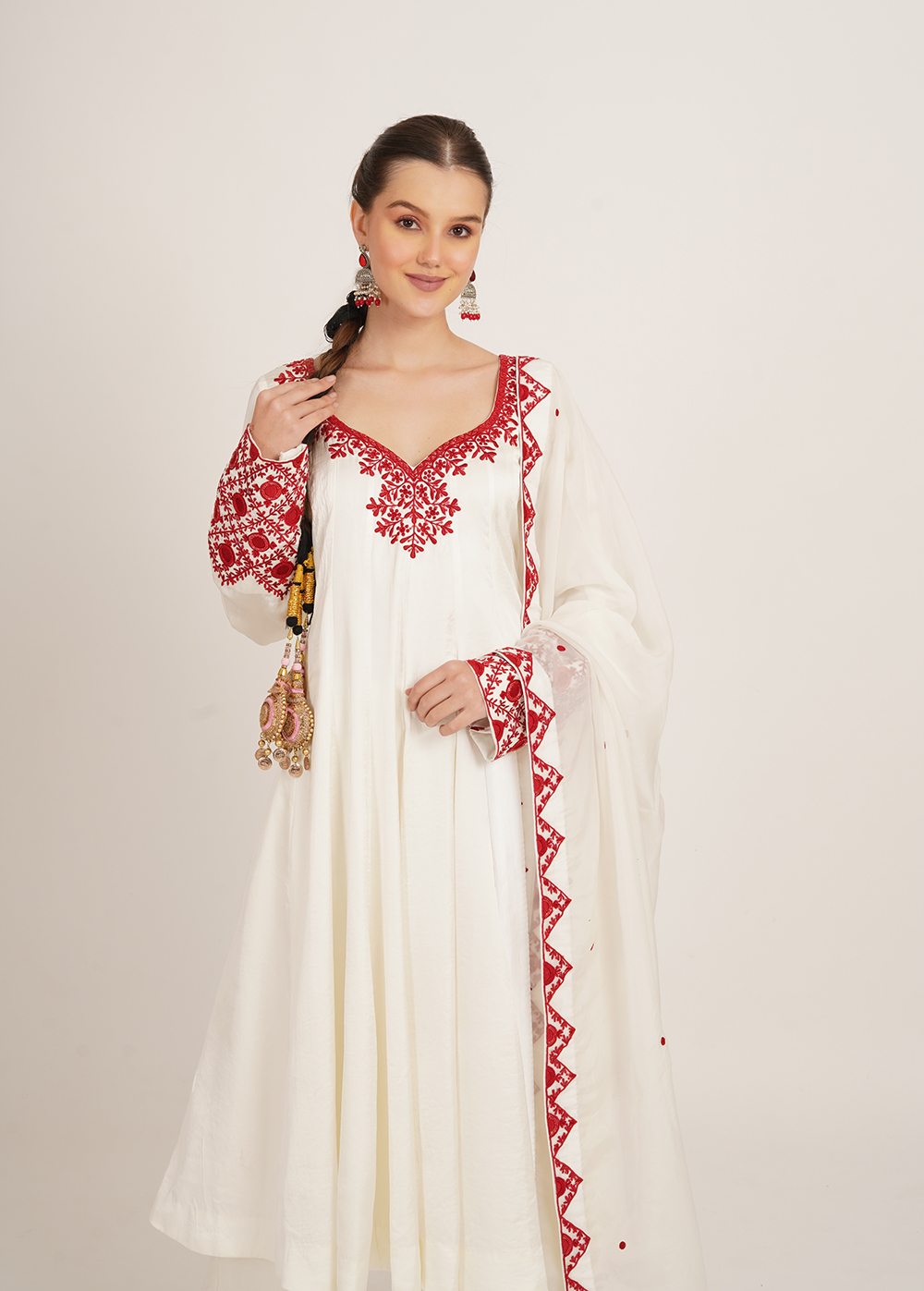Description- An elegant kalidaar set in off-white and red, crafted in imported satin with intricate embroidery and handwork. Paired with a beautifully embroidered organza dupatta, it is a timeless festive essential.